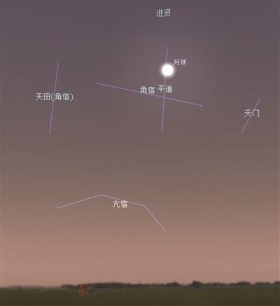 传说中白鹿口衔的杏花提示了时间——从惊蛰三候的花信来看,一候为桃花,二候为杏花,三候为蔷薇。从温州物候来看,杏花的开放时节一般为农历二月。结合白鹿出现在西南郊的说法,笔者利用虚拟天文馆软件(Stellarium1.2.0)浏览温州西南方的春季夜空,发现公元323年4月6日(农历二月十四日)黄昏至7日(十五日)凌晨出现了不寻常的天象——满月与角宿一、二与平道一、二四颗星组成的十字同时升起。持续观测发现,满月逐渐进入四颗星组成的十字中心,零点二十分至一点三十分左右(子时至丑时),满月一直处于角宿“十字”中心。此时角宿“十字”如花瓣,满月如花心,两者组合宛如天空中的花朵。子时是中国古代观测星空的又一常用时刻,满月十分醒目,加之角宿为二十八星宿之首,这朵恰好出现在郡城西南上空的“夜空之花”,在古人眼中非比寻常,很有可能被认为是“祥瑞”。而4月6日19点整的温州夜空,斗柄指向东方,为地支卯位,属于农历二月天象,与杏花盛开时节相合。