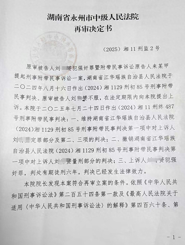 2025年7月24日,永州中院作出二审判决,维持一审定罪和附带民事判决,撤销一审判决的量刑部分,以强奸罪判处刘某赟有期徒刑六年。