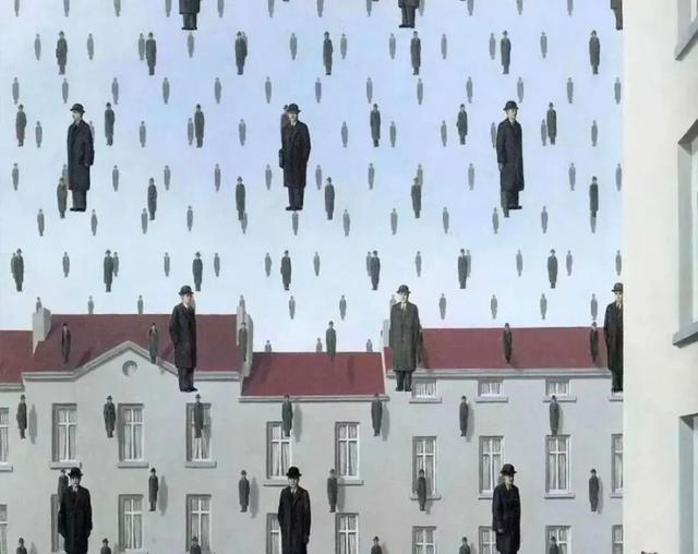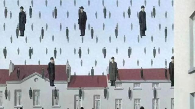 让我们先回到马格利特本身。这位比利时超现实主义巨匠,一生痴迷于颠覆视觉常规,在熟悉之物中植入陌生的刺点。在《戈尔孔达》中,无数身穿深色大衣、头戴圆顶礼帽的男子如雨滴般凝固在半空,悬浮于布鲁塞尔寻常街巷之上。马格利特的“惊异”绝非简单惊吓,而是制造出一种深刻的“疏离感”,堪称精密的哲学装置:通过剥离物体惯常的语境与重力,他迫使我们直视“存在”本身的怪异与神秘。画中人的悬浮,是一种集体性的、静默的“存在的悬置”,它邀请观众进入一场关于个体与群体关系的沉思。这种“惊悚”内蕴着潜能——将人从认知惰性中震醒,重新看见世界的不可解。