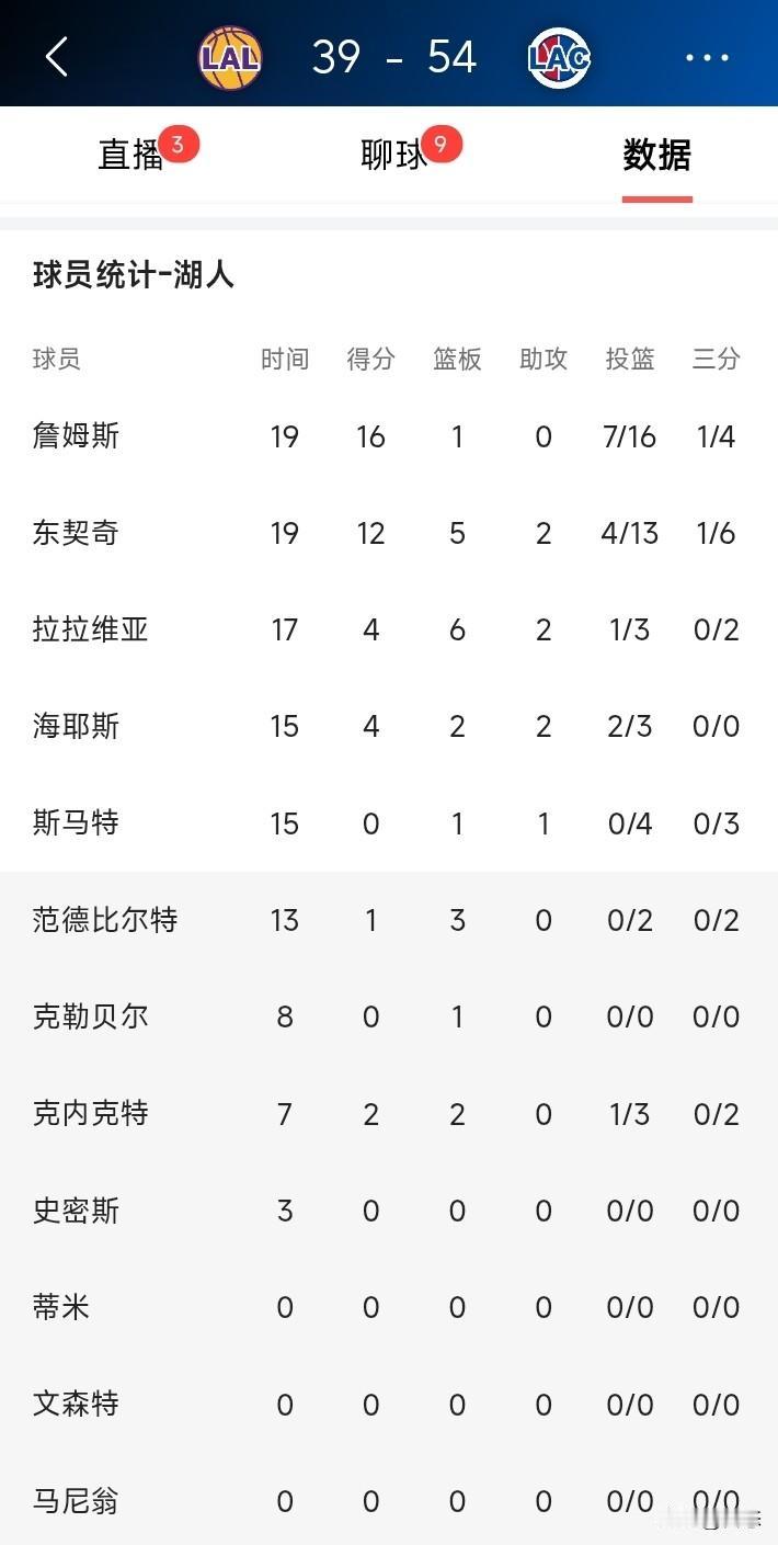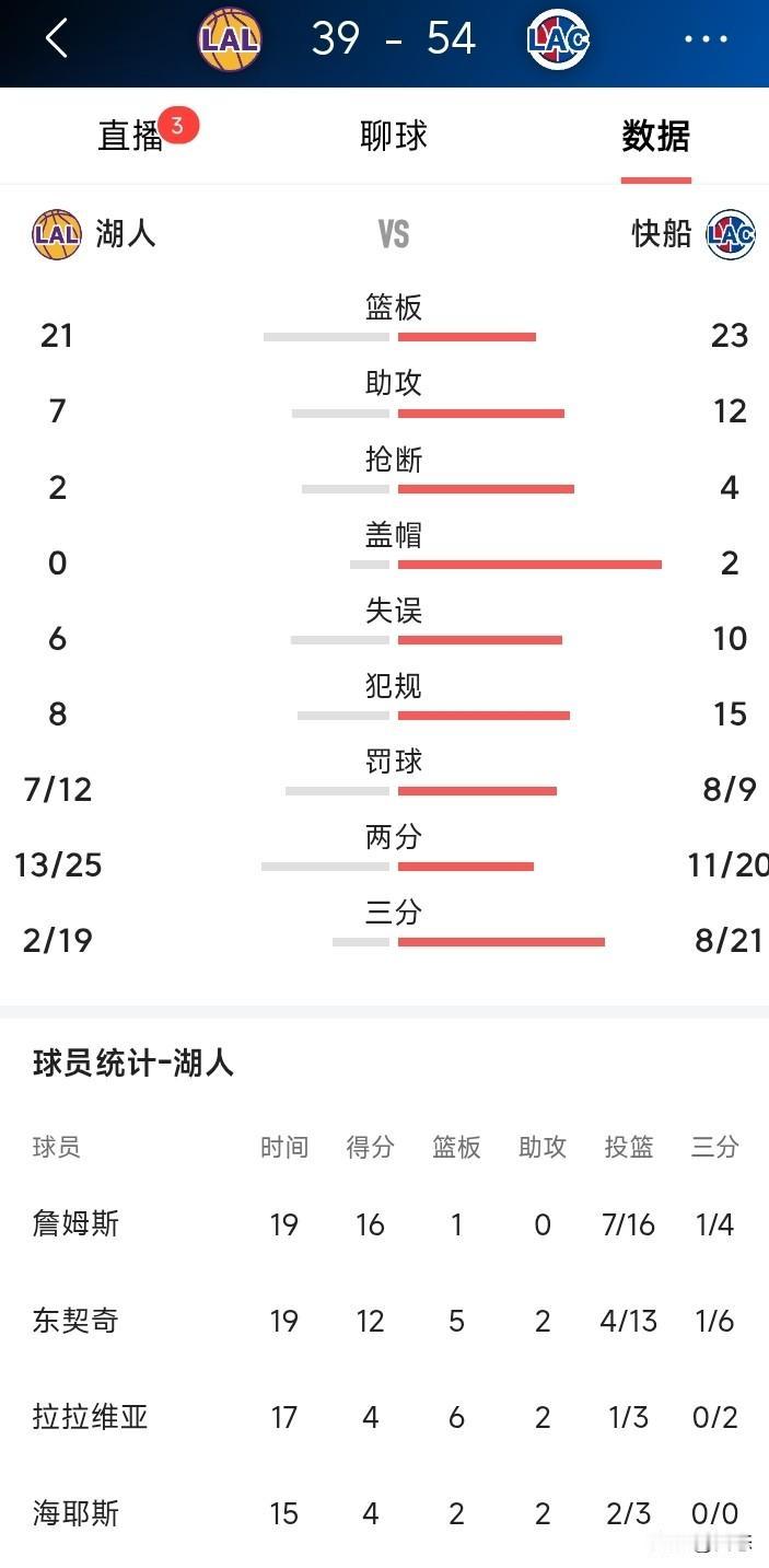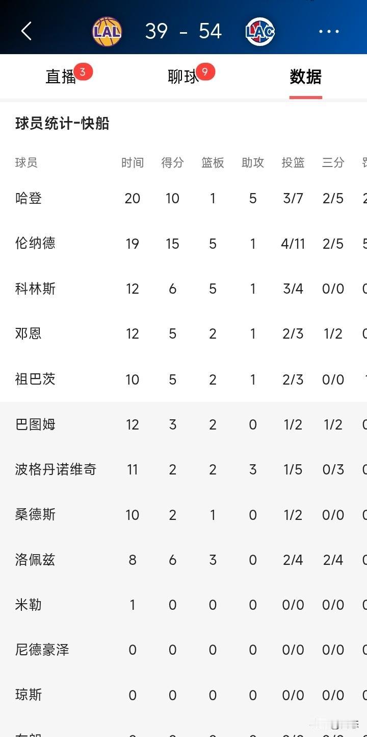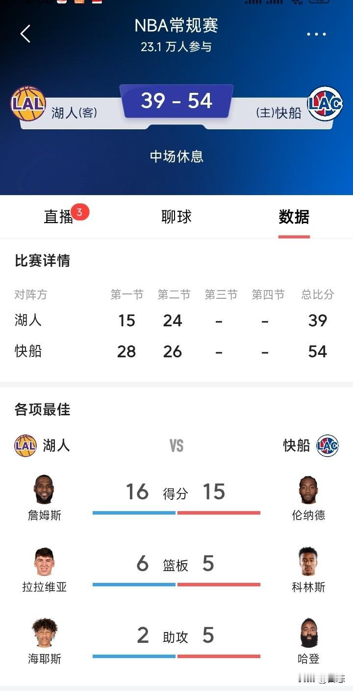 湖人客场调整快船,两个流量大队,上半场快船依旧延续以前的打好开局,快船54比湖人39,大比分领先。 湖人几个主力不打,哈登带领快船半场击溃湖人。 希望下半场不要崩盘,快船太需要赢下比赛了。 你们觉得快船能稳住吗?