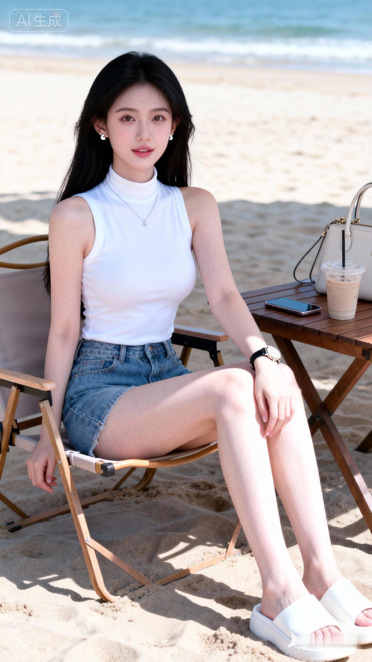 海边休闲时光,清爽白T恤搭配牛仔短裤,轻松自在!🌊👗👒
