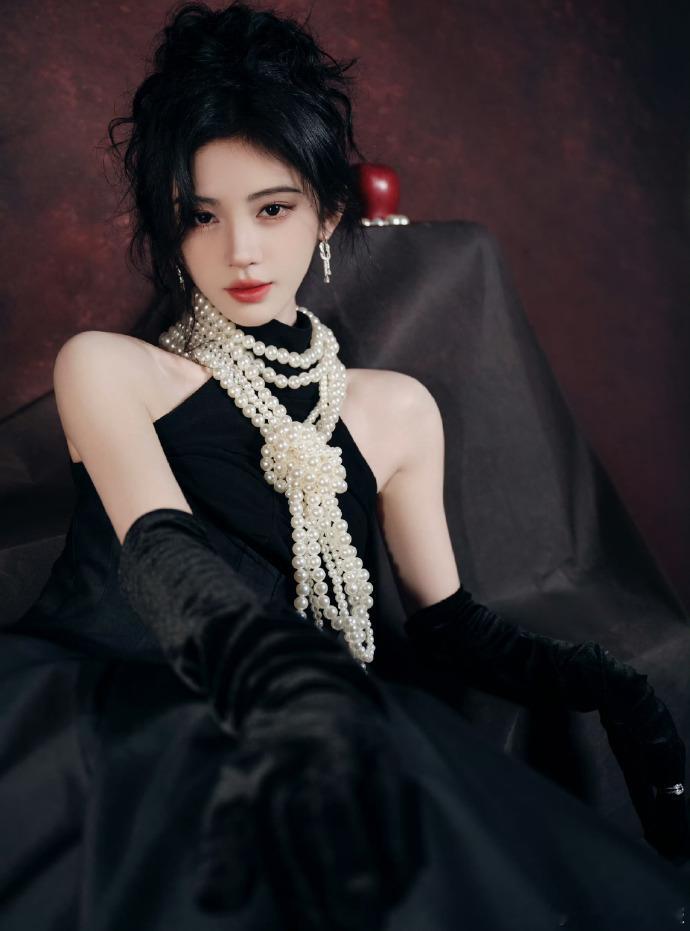 鞠婧祎珍珠项链叠戴鞠婧祎戴了好长的珍珠项链珍珠叠戴让黑裙层次分明,清冷眉眼撞上红
