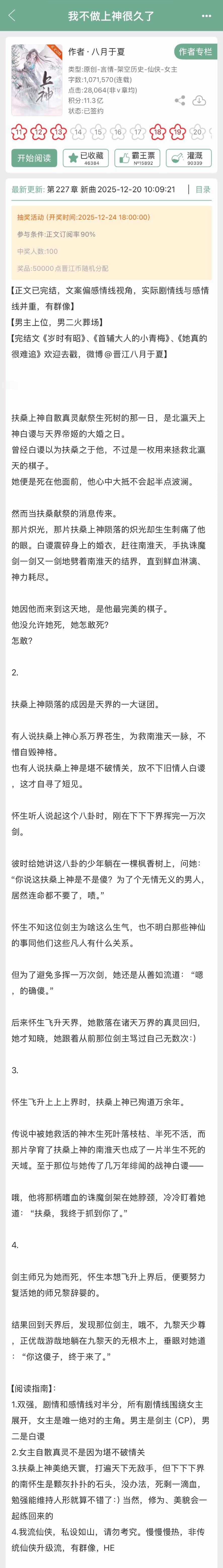 八月于夏的《我不做上神很久了》完结啦!仙侠文➕群像,男主上位,男二追妻火葬场