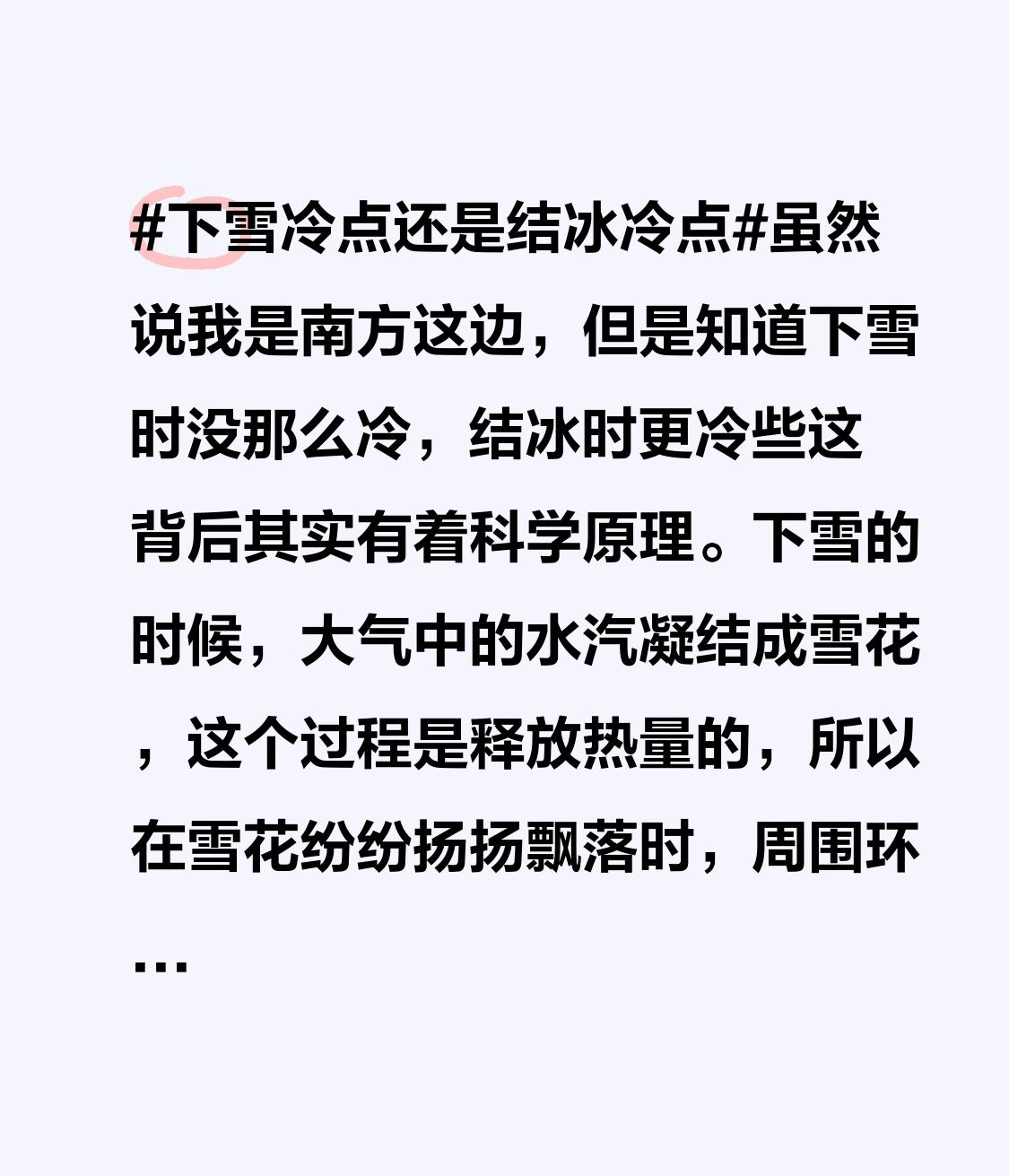 而结冰就不同了,水变成冰的过程是一个不断失去热量的过程。当气温持续下降到冰点以下,水开始结冰,它会不断地从周围环境中吸收热量,使得周边的温度降得更低。特别是在南方,没有北方那样完善的供暖设施,一旦结冰,那种湿冷就像魔法攻击一样,能穿透层层衣物,让人冷到骨子里。 我还记得之前南方偶尔下一次雪,大家都兴奋地跑出门去赏雪、玩雪,虽然气温也低,但身体还能承受。可要是遇到结冰天气,路面变得滑溜溜的,出行都成了难题,而且不管穿多厚,身上都是冷飕飕的,感觉整个身体都被寒意包裹。所以说,结冰可比下雪冷多了。