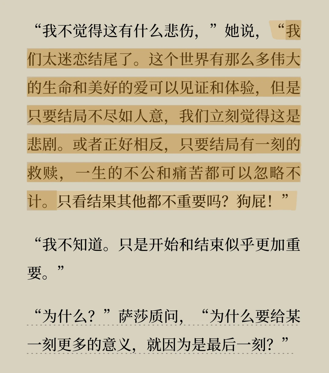 “我们太迷恋结尾了。这个世界有那么多伟大的生命和美好的爱可以见证和体验,但只要结局不尽如人意,我们立刻觉得这是悲剧。或者正好相反,只要结局有一刻的救赎,一生的不公和痛苦都可以忽略不计。狗屁!”