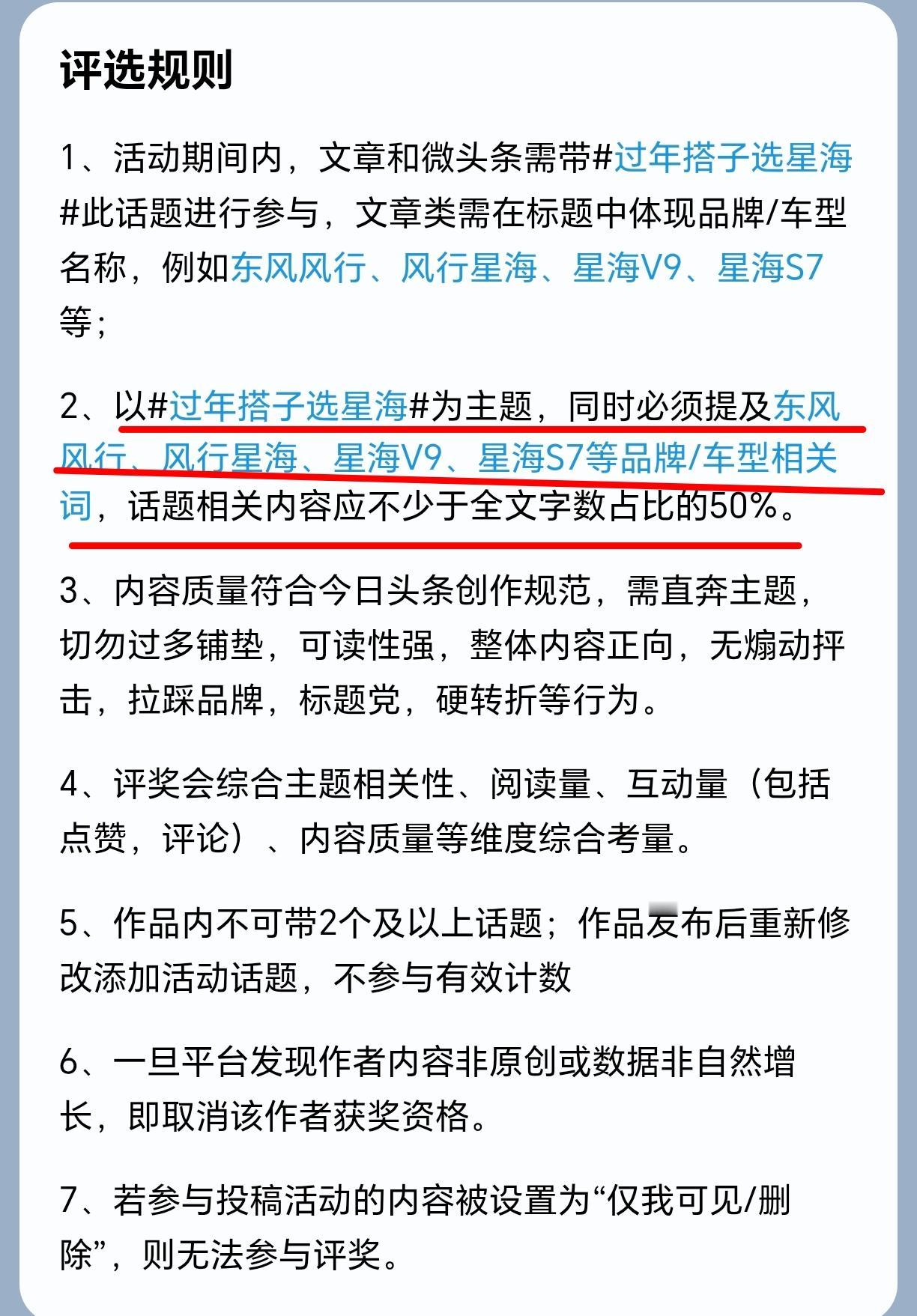 新来的两个汽车征文已经完成了,抽到一个小红包还不错,不过这个过年搭子选星海征文规则的第二条是以过年搭子选星海为主题,同时必须提及东风风行、风行星海、星海V9、星海S7等品牌/车型相关词, 话题相关内容应不少于全文字数占比的50%。 这个规则看不太懂,不知道是写一个车还是两个车,为了保险起见,两个车我都提了一下,也不知道对不对,有明白的友友可以解释一下吗?