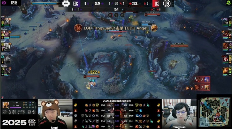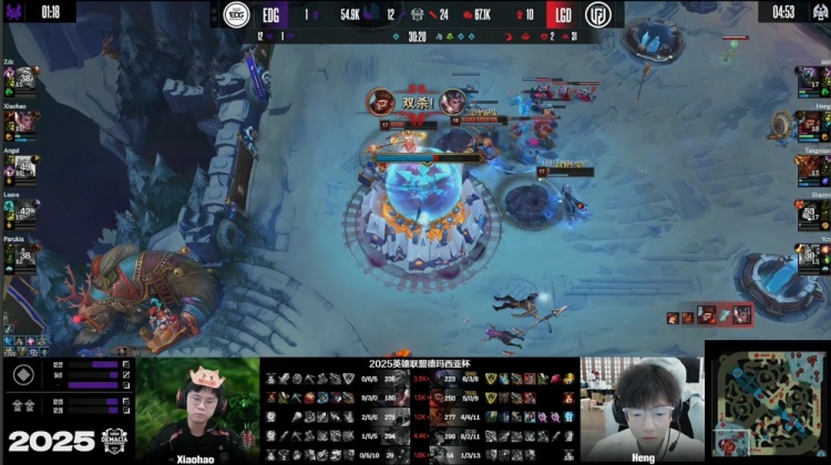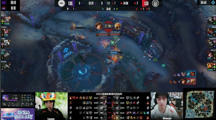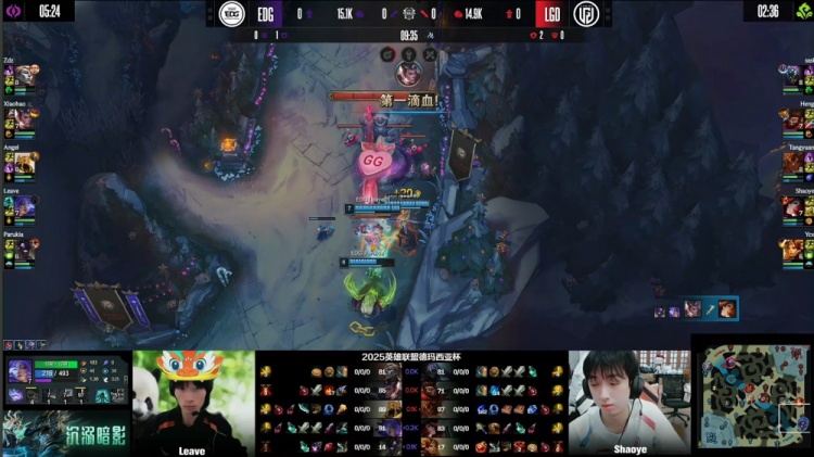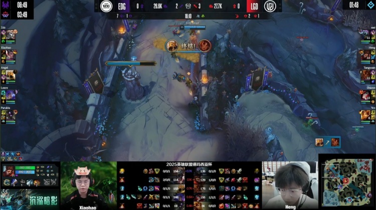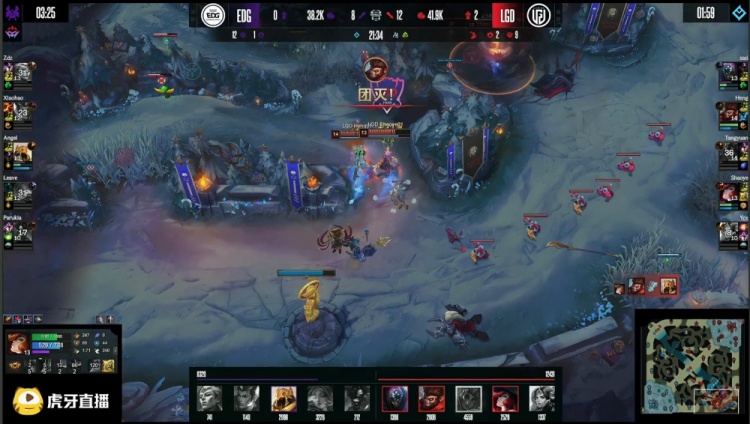 [20:48]厄塔汗团战,Xiaohao赵信先捅飞Ycx,但sasi贾克斯绕后配合队友融化团灭EDG,Zdz亚恒又被秒杀,LGD打出2换5吃掉厄塔汗,经济领先4k。