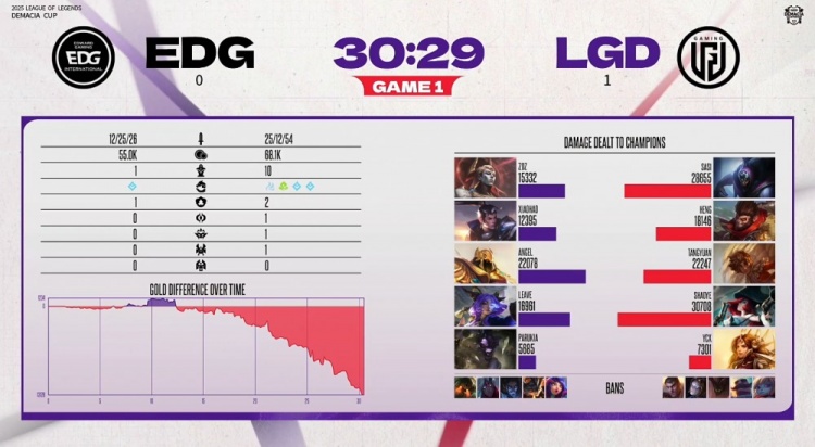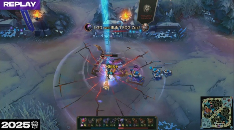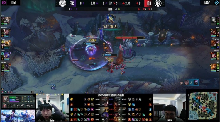 [25:03]下路皇城pk,Sasi贾克斯单杀Zdz亚恒,随后sasi推掉EDG下路二塔,angel沙皇来下配合队友击杀sasi,正面LGD拿到大龙,经济领先7k。