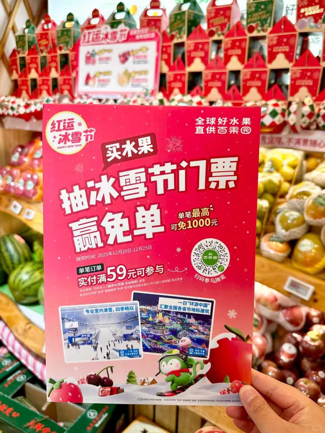 敲黑板:12.20-12.25买水果单笔实付满59元还能抽冰雪节门票、赢免单!