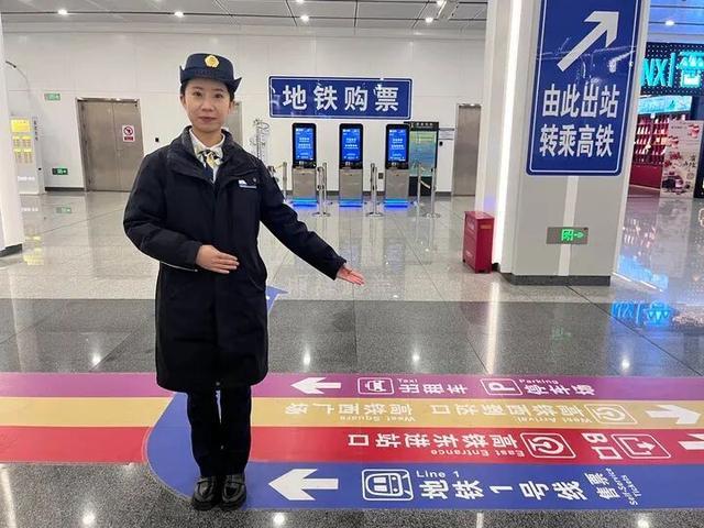 本次服务升级聚焦乘客出行规律,结合地铁进出站以及地铁、高铁、公交、出租之间的换乘需求,在站厅区域增设6条“跑马道”式地面引导线。引导线针对A出入口、B出入口、网约车上车点、出租车候车区(含社会车辆停车场)、地铁安检点(含售票窗口、客服中心)及高铁站西广场等核心区域,分别设定鲜明主题色,连续延伸,并配备中、英文规范提示。无论乘客是换乘高铁、搭乘公交、寻找网约车,还是前往停车场,只需“跟着颜色走”,即可轻松抵达目的地,大幅提升效率,告别“迷茫”。