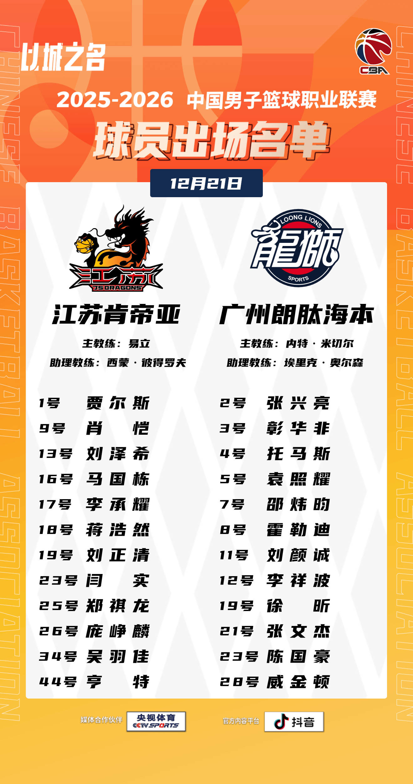 虎扑12月21日讯今日CBA常规赛,江苏对阵广州的大名单已经公布。