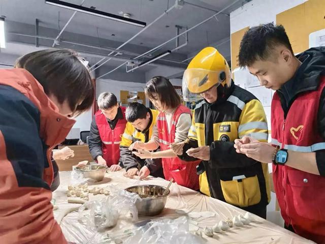 志愿者们提前准备好饺子皮、馅料等食材,来到外卖站点,忙碌起来。不时有送完早高峰订单的外卖小哥返回,马上加入,一起包着饺子。这个群体年轻人较多,有人手法生疏,志愿者耐心教,现场其乐融融。