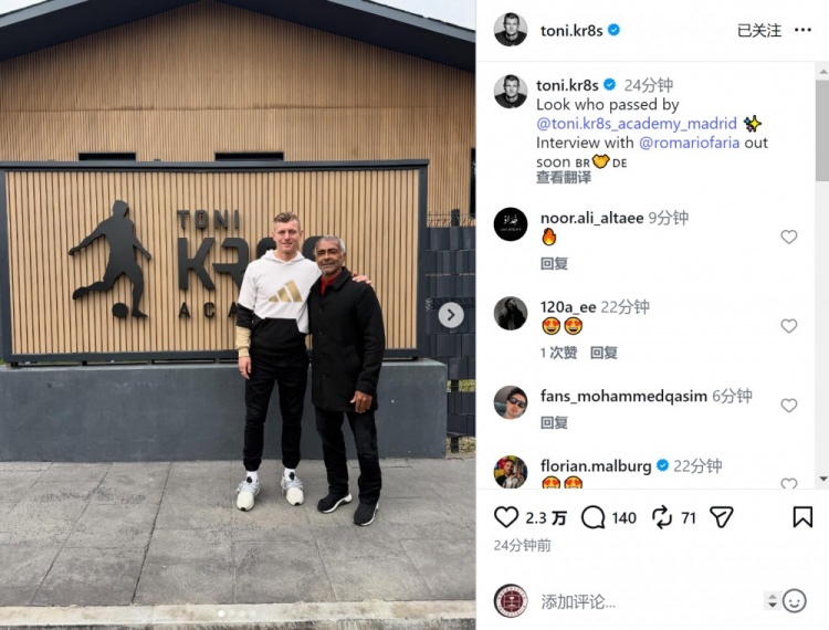 克罗斯社媒晒出合照,配文:“看看谁来青训学院了?与罗马里奥的专访即将发布。”