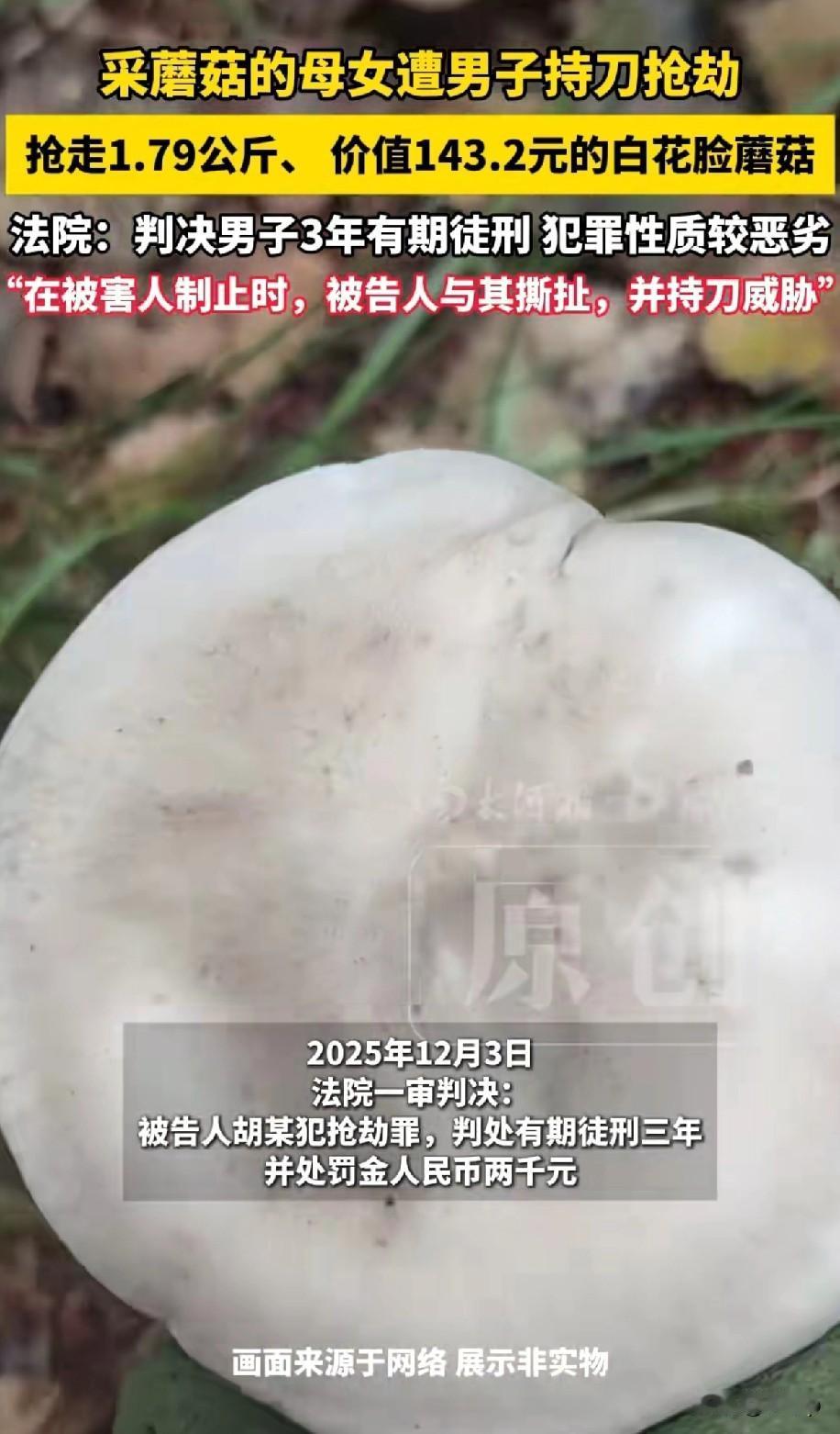 采蘑菇的母女遭男子持刀抢劫 抢走蘑菇1.79公斤,价值143块.2毛 最后法院判决男子3年有期徒刑 并处罚金人民币两千 看似价值不多的蘑菇,竟然让他面对3年的牢狱生活,关键问题就是持刀 根据我国《刑法》第263条规定 以暴力或者胁迫以及其他方法抢劫公私财物的处三年以上,十年以下有期徒刑,并处罚金,致人伤亡的处十年以上或者无期甚至死刑,加没收财产 抢劫是重罪!尤其是持刀抢劫,所以这名男子被判的还算轻的,就为了一百多块钱的蘑菇,估计这名男子肠子都悔青了。