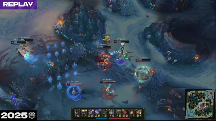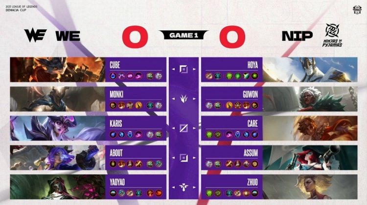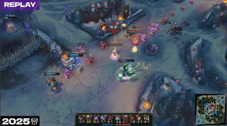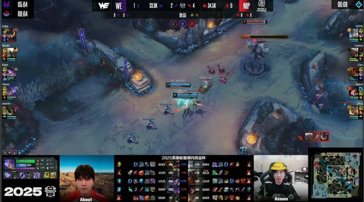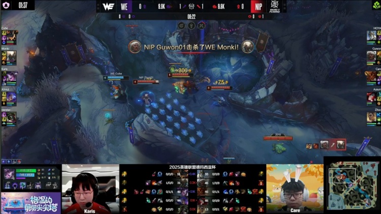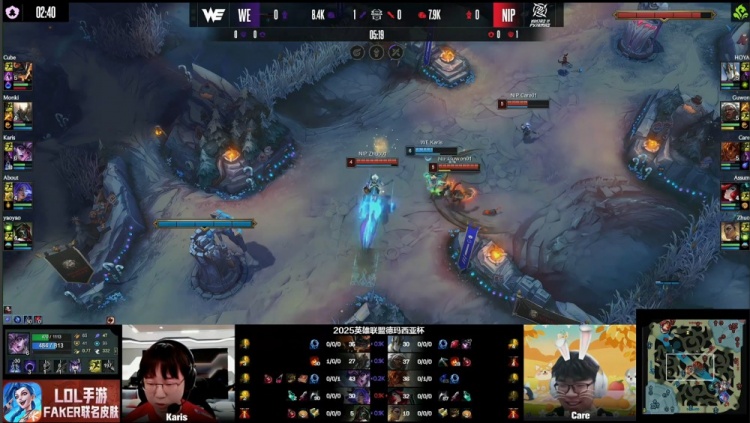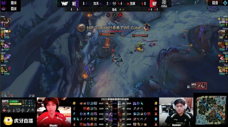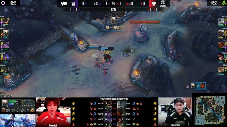 [19:55]Guwon安蓓萨上路叒配合Care岩雀逮捕Cube兰博,随后NIP三人吃掉厄塔汗,Monki潘森跳大进场留人,Karis辛德拉EQ晕NIP三人后击杀Guwon安蓓萨,上路Karis辛德拉推球击中Zhuo指挥,About芸阿娜拿到Zhuo,WE打出0换2。