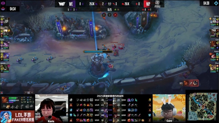 [28:44]中路混战,HOYA加里奥吸两人,Karis辛德拉大招融化Guwon安蓓萨,Assum女枪反手双杀,双方野辅互换,NIP三人推掉WE中路一塔,NIP经济领先2k。