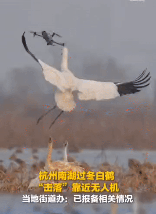 杭州白鹤怒击无人机!事情岂能不了了之? 25年12月20日下午,南湖湿地,一只携带幼鹤的成年白鹤正在觅食时,有人放无人机拍白鹤。拍摄者为了拍摄视角,多次调整方位。拍摄者用无人机多次挑衅白鹤,白鹤多次抬头警戒并展翅警告无效后,突然飞起用翅膀和脚部猛击无人机,最终将其踹入藕塘淤泥中。目击者称白鹤一家随后飞离,未受伤。 这位拍摄者是不知道白鹤为国家一级重点保护野生动物。若无人机的螺旋桨叶片或机体对白鹤成伤害,就违反《野生动物保护法》。 而且25年杭州明确无人机“黑飞”行为的法律后果。未实名登记罚200-2000元;无证飞行罚款1000-2000元。不知道这位拍摄者的无人机进行了实名登记了吗?以及飞行进行报备没有? 目前余杭街道办方面表示,这种行为“影响野生动物生存”,已经报备相关情况,而当地公安机关还没介入调查。近些年来随着商业利益的驱动,越来越多的观鸟拍摄者为了拍摄到最具价值的图片而使用无人机进行拍摄,也发生过多次无人机对野生动物造成伤害的事件,却都没有引起重视。希望有关部门把这次事件引以为鉴重视起来。也希望无人机厂家对于保护区这样的特殊区域设置“电子栅栏”。西湖无人机