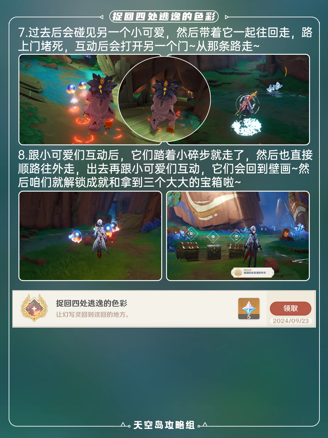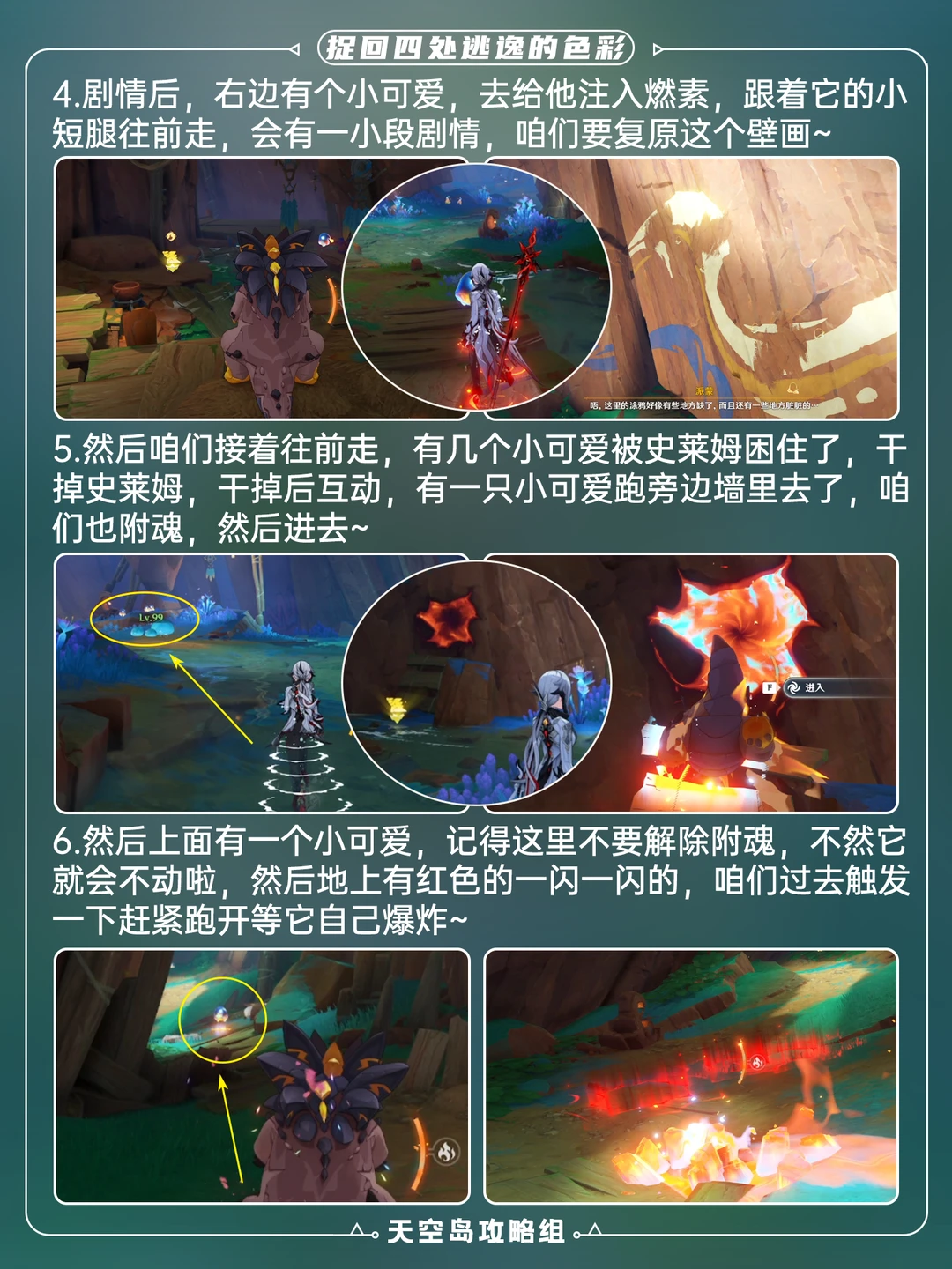 5.0版本纳塔新增成就「捉回四处逃逸的色彩」[哇R] 可获得2珍贵+1华丽宝箱 让幻写灵回到该回的地方就能完成 1⃣️到达p2地点,然后魂附嵴锋龙 2⃣️进入裂隙后跟随幻写灵进入洞窟,引爆爆炸区域 3⃣️跟随剧情对话幻写灵们,修复壁画 4⃣️注意不要解除魂附、打史莱姆