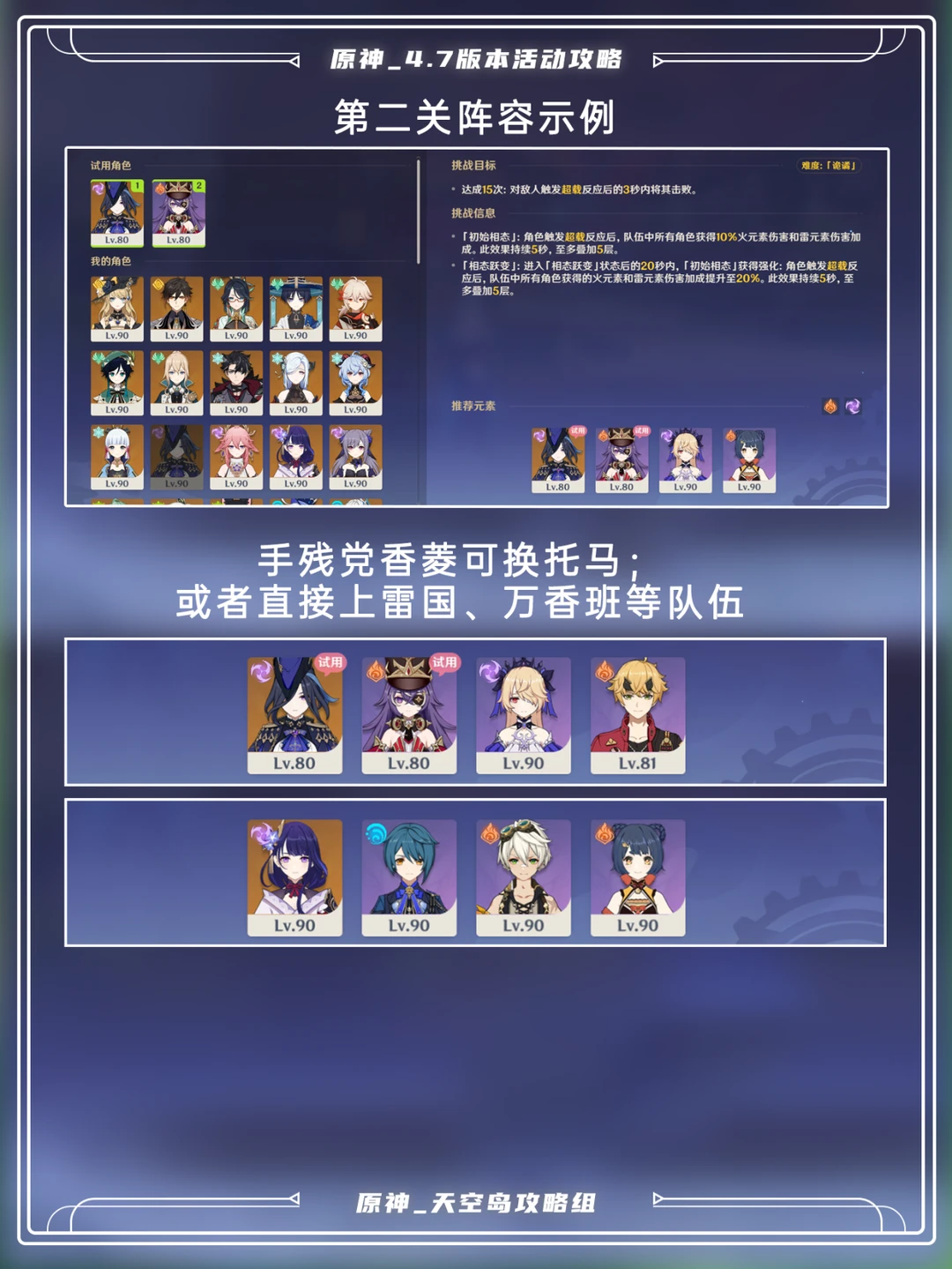 「纷变繁相豪武谭」1、2关攻略 首日可获得100原石![赞R] 推荐配队 第1⃣关:刻晴、托马、班尼特/温迪/万叶 第2⃣关:克洛琳德、夏沃蕾、托马/香菱 或者:雷国、万香班等 这次活动只开放6天,至30日(本周六)结束, 建议尽快做完[哇R]
