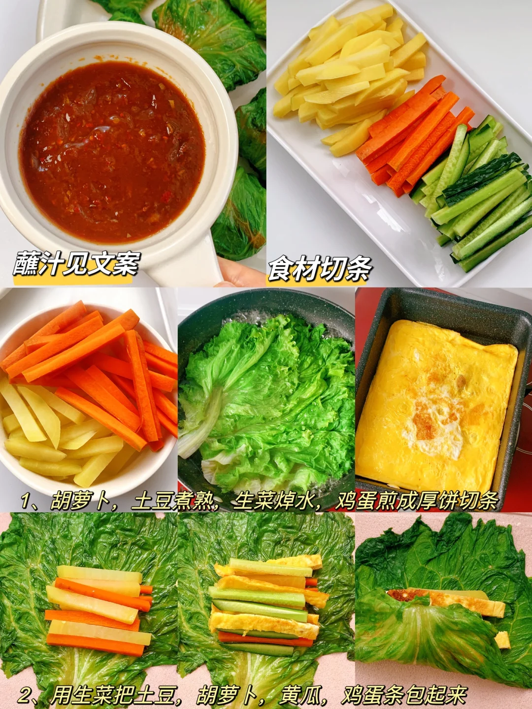 第一次吃就爱了,低卡好吃还饱腹,天气热了,想要减肥的姐妹们注意啦♨️ [飞吻R]hi,姐妹们,我又来分享减脂餐啦❗️进入主页🈶很多有手就会的家常减脂餐~~ ………………………………………………………………………………… 今日分享 【低卡土豆生菜卷】 食材: 主料:土豆,生菜,鸡蛋,黄瓜🥒,胡萝卜🥕 辅料:蒜泥,辣椒面,番茄酱,黄豆酱,淀粉,生抽 [打卡R]做法见图片[打卡R]图[七R] 蘸汁:两勺蒜末,一勺生抽,一勺黄豆酱,一勺辣椒面,一勺番茄酱,半勺淀粉➕清水搅匀⚠️小火煮制浓稠即可。(拌面吃也绝绝子[偷笑R]➕少许盐即可) ❤小提示:生菜水开加几滴香油,焯水15s即可 [烟花R][烟花R]让我们一起打卡吧~~