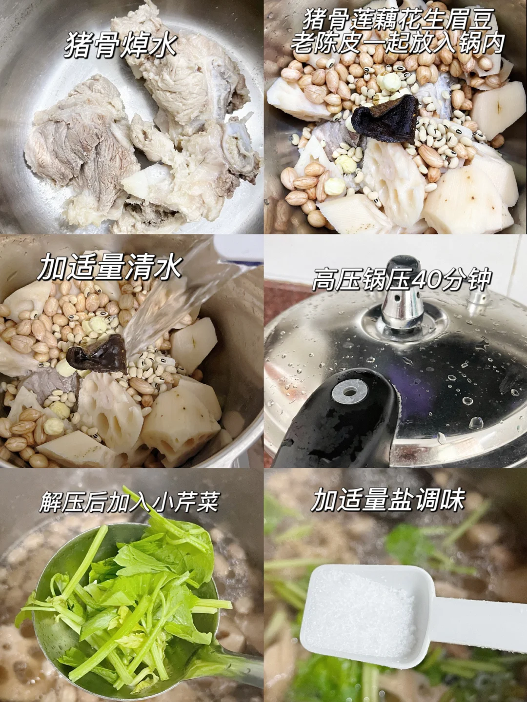 1️⃣ 花生眉豆提前泡2小时,猪骨焯水,莲藕切滚刀块,小芹菜切碎备用。