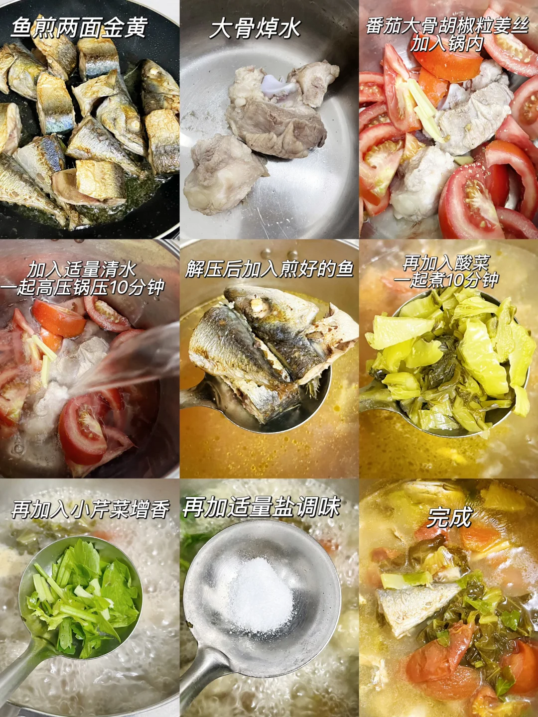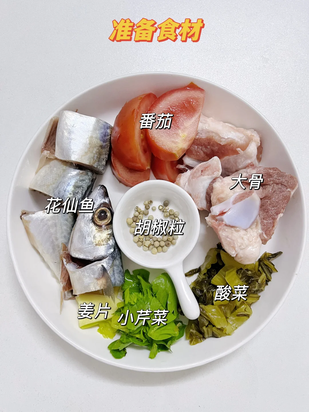 花仙鱼除了煎、焖,做鱼饭,还可以做鱼汤,今天用它做一道家常版番茄酸菜鱼汤,酸爽开胃巨下饭。 准备食材🫕 番茄、酸菜、花仙鱼、大骨、胡椒粒,小芹菜,姜片 做法🥘 1️⃣ 食材全部洗净切好,鱼煎两面金黄,大骨焯水。 2️⃣大骨+胡椒粒+姜片+番茄+适量清水,高压锅先压10分钟,解压后加入煎好的鱼,酸菜,一起煮10分钟。 3️⃣ 蕞后撒小芹菜碎,加盐调味。 酸爽开胃的汤就完成啦!鱼肉嫩滑,酸菜脆爽,连喝三碗都不够!