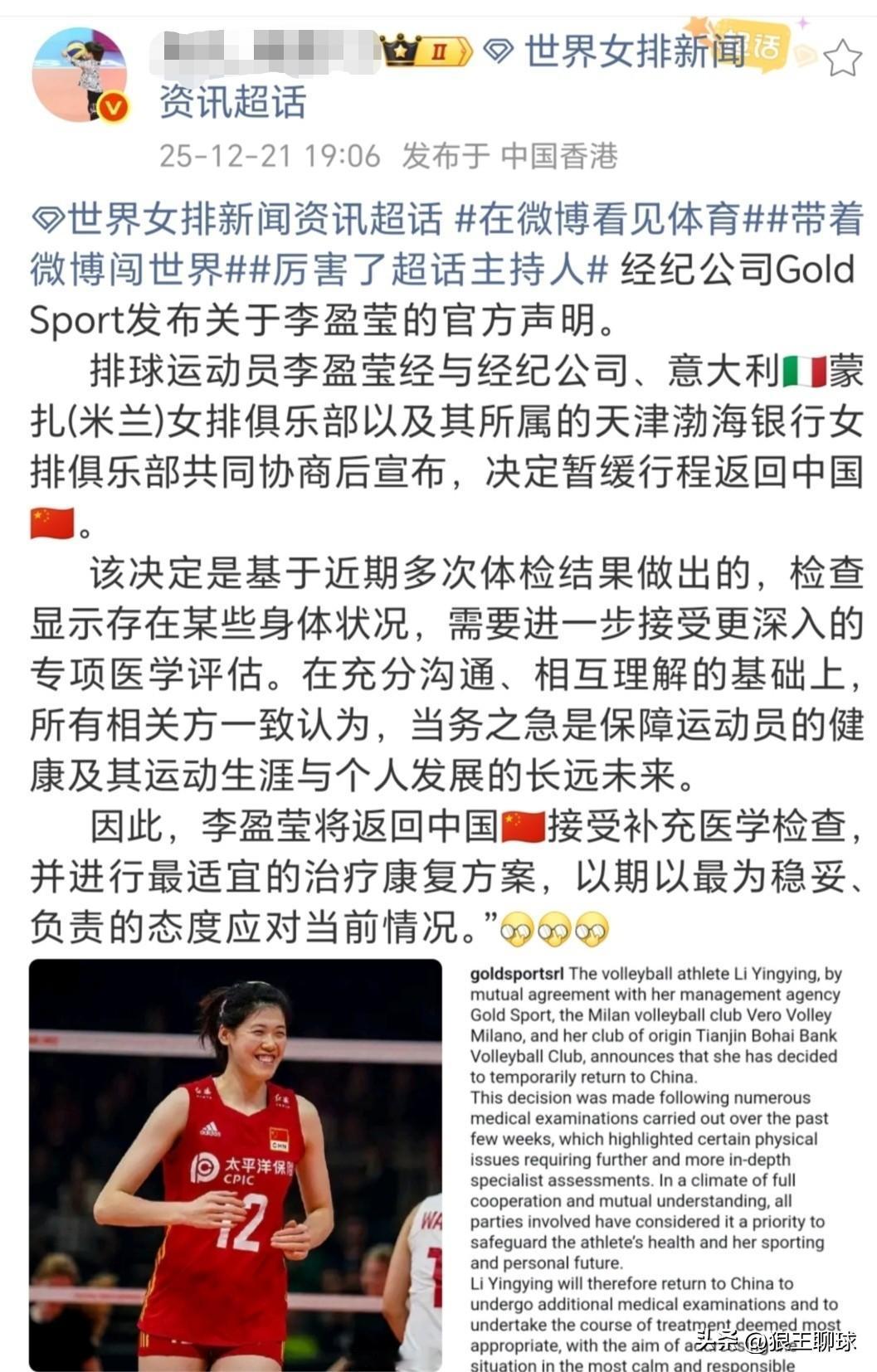 经纪公司Gold Sport发布关于李盈莹的官方声明。 排球运动员李盈莹经与经纪公司、意大利🇮🇹蒙扎(米兰)女排俱乐部以及其所属的天津渤海银行女排俱乐部共同协商后宣布,决定暂缓行程返回中国🇨🇳。 该决定是基于近期多次体检结果做出的,检查显示存在某些身体状况,需要进一步接受更深入的专项医学评估。在充分沟通、相互理解的基础上,所有相关方一致认为,当务之急是保障运动员的健康及其运动生涯与个人发展的长远未来。 因此,李盈莹将返回中国🇨🇳接受补充医学检查,并进行最适宜的治疗康复方案,以期以最为稳妥、负责的态度应对当前情况。” 大家注意一下,是暂缓行程,没有说结束签约,看来还是非常看重李盈莹的,只不过国外俱乐部对健康和国内确实不一样,国内教育是轻伤不下火线,只要能坚持,在赛场上能拿分,就尽量上场,至于伤情加重,以后再考虑,其实运动员健康最重要,培养一名球员要多少年,职业巅峰期就那么几年,耽误了就毁了!