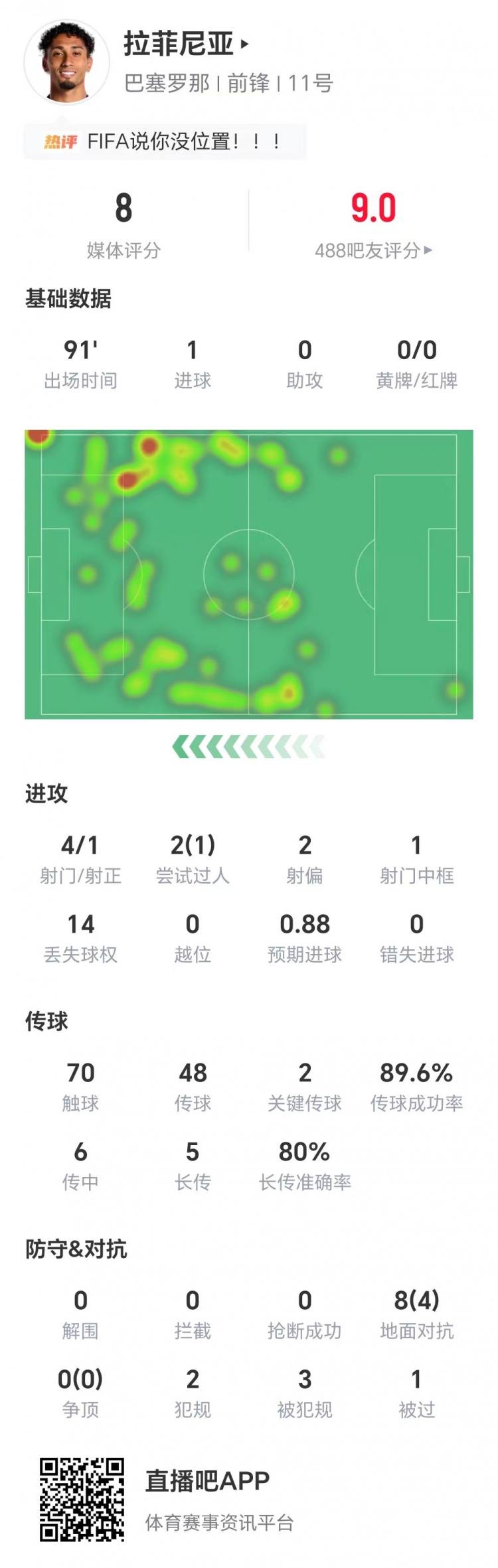 赛后技术统计数据显示,拉菲尼亚本场比赛4射1正,两次过人1次成功,1次射门中框,两次关键传球。