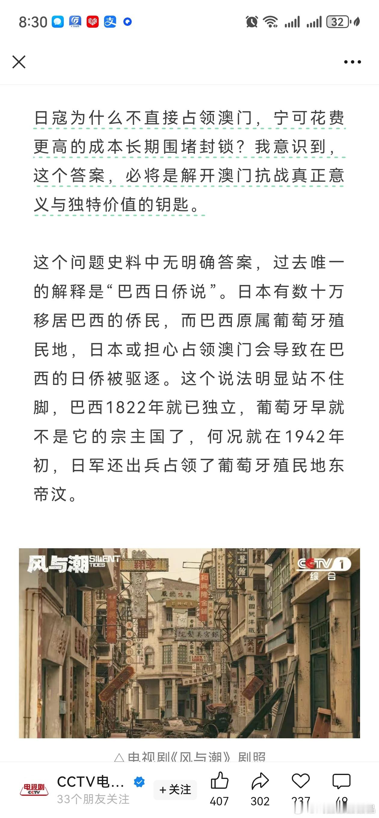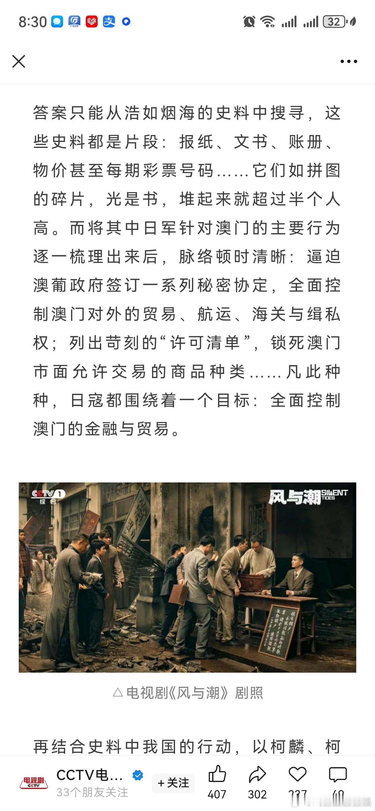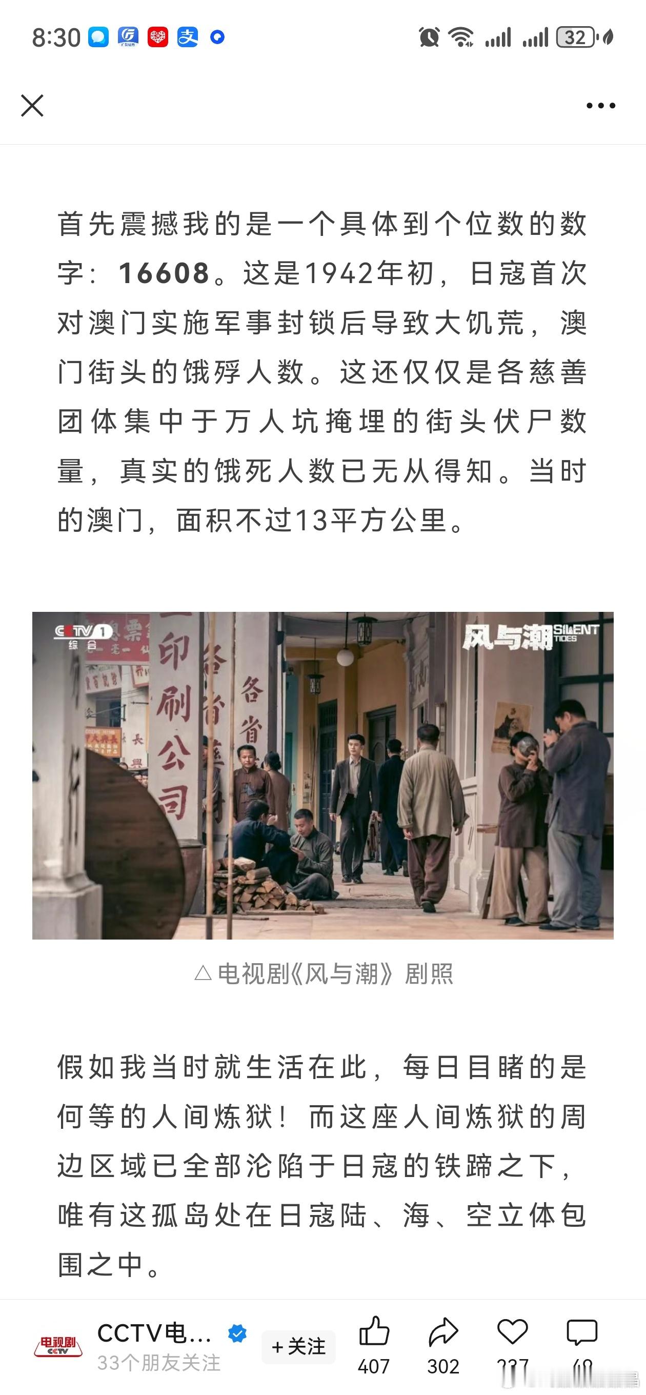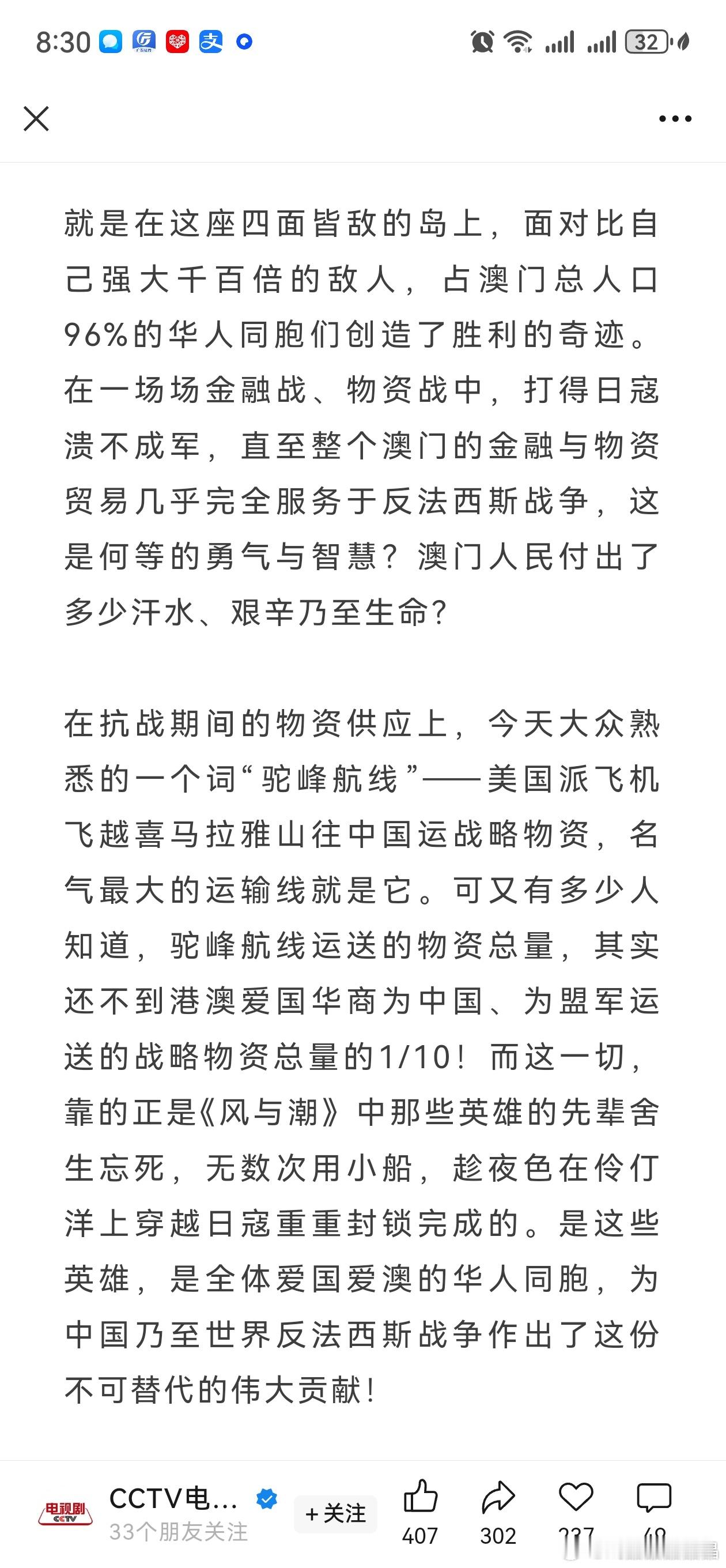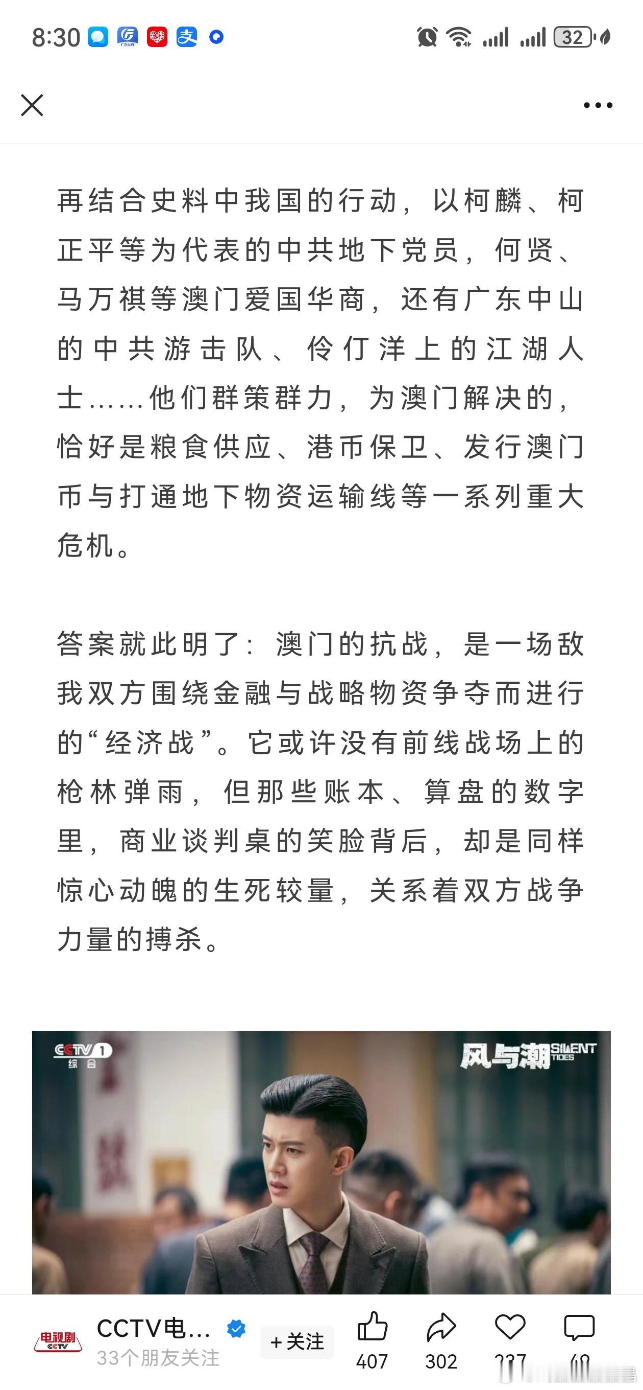 《风与潮》总编剧黄晖人民日报撰文:拨开迷雾,重新认识澳门。电视剧风与潮 澳门的抗战,是一场敌我双方围绕金融与战略物资争夺而进行的“经济战”。它或许没有前线战场上的枪林弹雨,但那些账本、算盘的数字里,商业谈判桌的笑脸背后,却是同样惊心动魄的生死较量,关系着双方战争力量的搏杀。在抗战期间的物资供应上,今天大众熟悉的一个词“驼峰航线”——美国派飞机飞越喜马拉雅山往中国运战略物资,名气最大的运输线就是它。可又有多少人知道,驼峰航线运送的物资总量,其实还不到港澳爱国华商为中国、为盟军运送的战略物资总量的1/10!而这一切,靠的正是《风与潮》中那些英雄的先辈舍生忘死,无数次用小船,趁夜色在伶仃洋上穿越日寇重重封锁完成的。是这些英雄,是全体爱国爱澳的华人同胞,为中国乃至世界反法西斯战争作出了这份不可替代的伟大贡献!任嘉伦风与潮