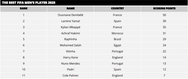 在2025年金球奖评选中,拉菲尼亚只获得620分排名第5,其俱乐部队友亚马尔获得第2,登贝莱获得金球奖。