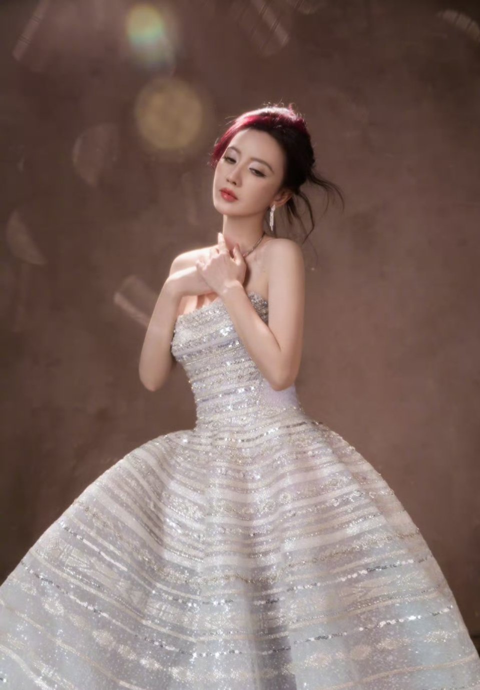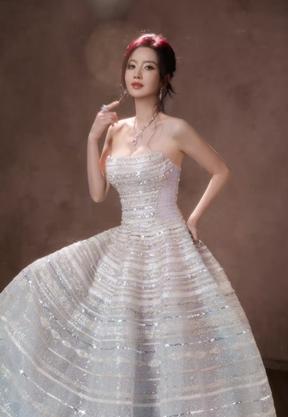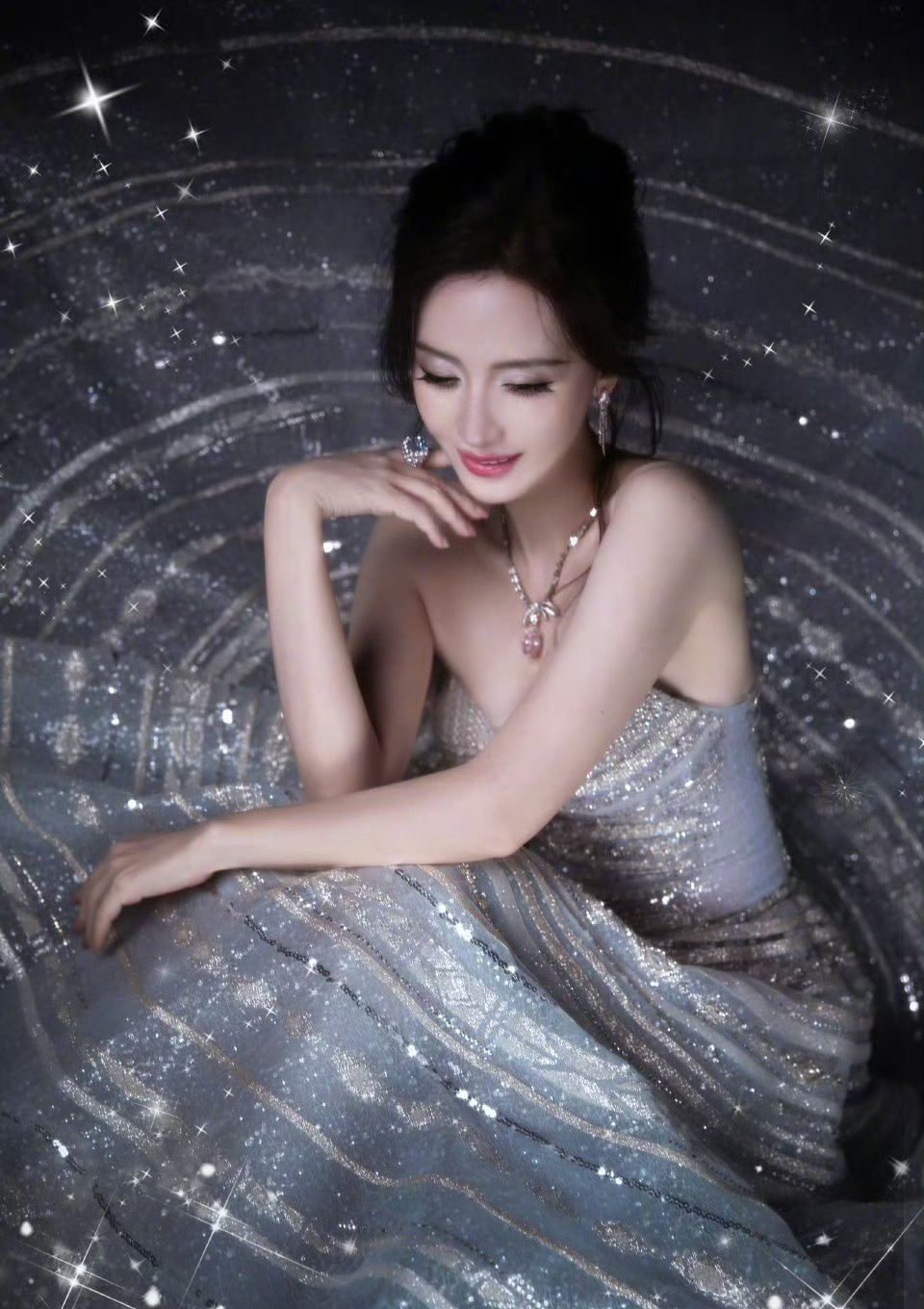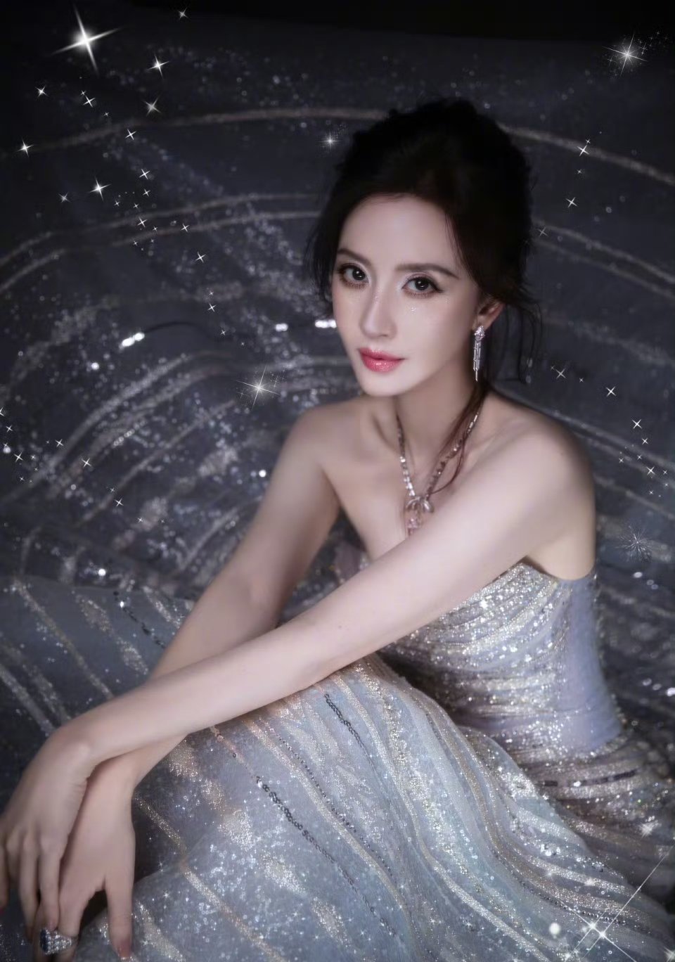 张萌这裙子好绝,一铺开就像她身处浩瀚星空一样,熠熠生辉。不过张萌的脸怎么回事,被