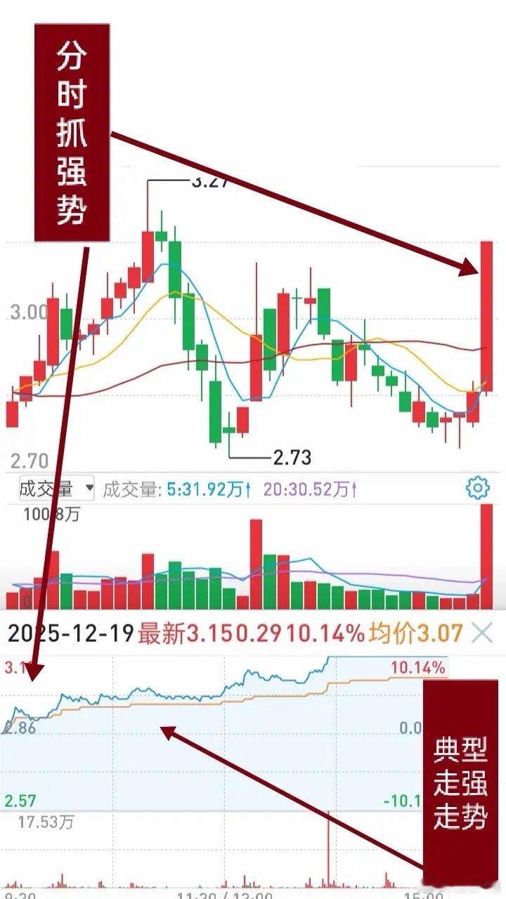 短线分时交易技巧:抓分时强势股分享一个短线分时交易模式,核心就是利用分时图捕捉强势股。当股价在分时均价线上方运行,同时量能温和放大,往往预示主力后续有大动作。此前的交易模式以K线为主,分时仅作为辅助。但做短线,细节决定成败,研究分时图的意义和价值至关重要。不管牛市熊市,不懂市场和个股走势,赚钱都很难。分时图反映个股当日走势,掌握分时股价运行规律,短线成功就有了一半以上的把握。回到这个交易模式:通过技术分析捕捉强势股上涨特征,在分时图上找到强势信号,于相对低位买入,成功概率很高。给大家分享两个实战特征,这种分时图形其实很常见,只是很多人没专心研究过:1. 个股处于突破位或主升阶段,开盘半小时内不跌破开盘价,股价涨幅2个点左右,始终在分时均价线上方小幅震荡,此时就要重点关注。2. 随着交易推进,股价不回落反持续攀升,成交量同步放大、一浪高过一浪。这个形态,直接说明主力做多意图强烈。平时复盘昨日涨停或大涨个股,经常能见到这种分时。我们可以在股价突破或回调时试错买入,当天大概率能吃到大肉。这种阶梯式上行,本身就有逻辑支撑,代表主力主动攻击,可能是主力实力中等,也可能是上方抛压较重。短线玩法很多,能抓龙头翻倍、能做涨停板赚溢价、也能靠成交量拐点盈利,但最终都要落到分时交易上。所以,一定要下功夫提升分时图的研判能力。多看图慢慢领会,全是干货!仅供交流,点赞关注,获取更多技巧。