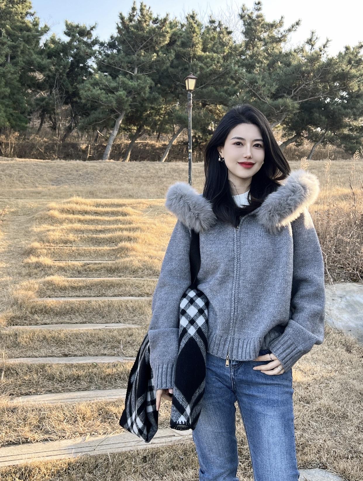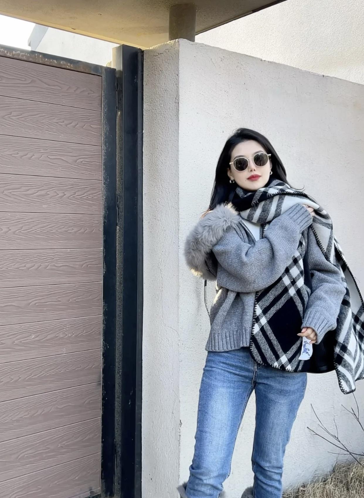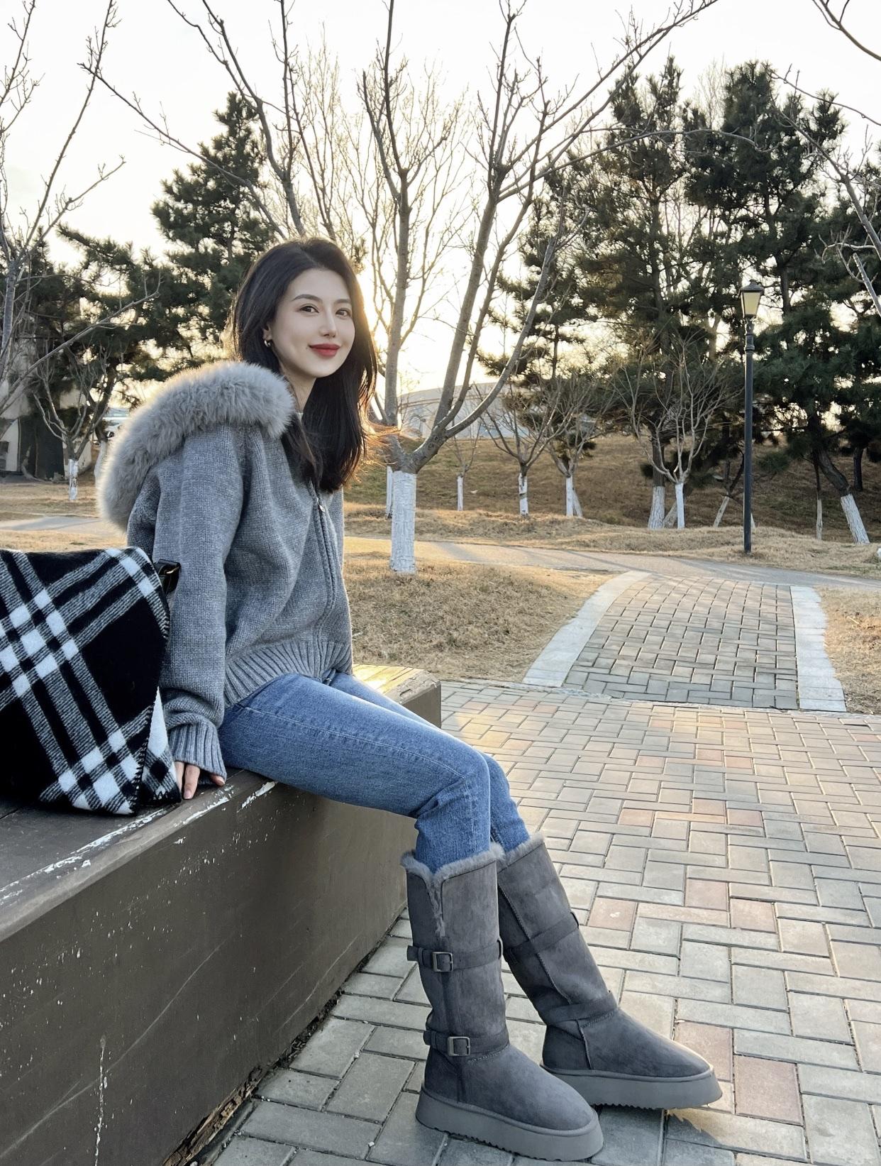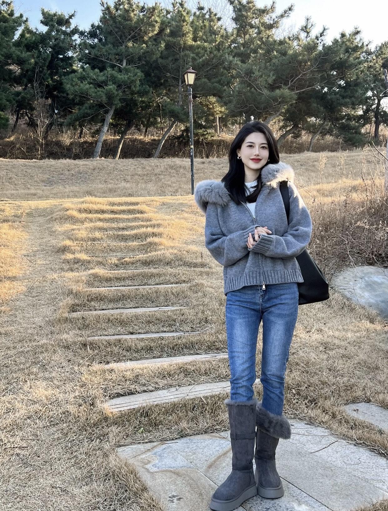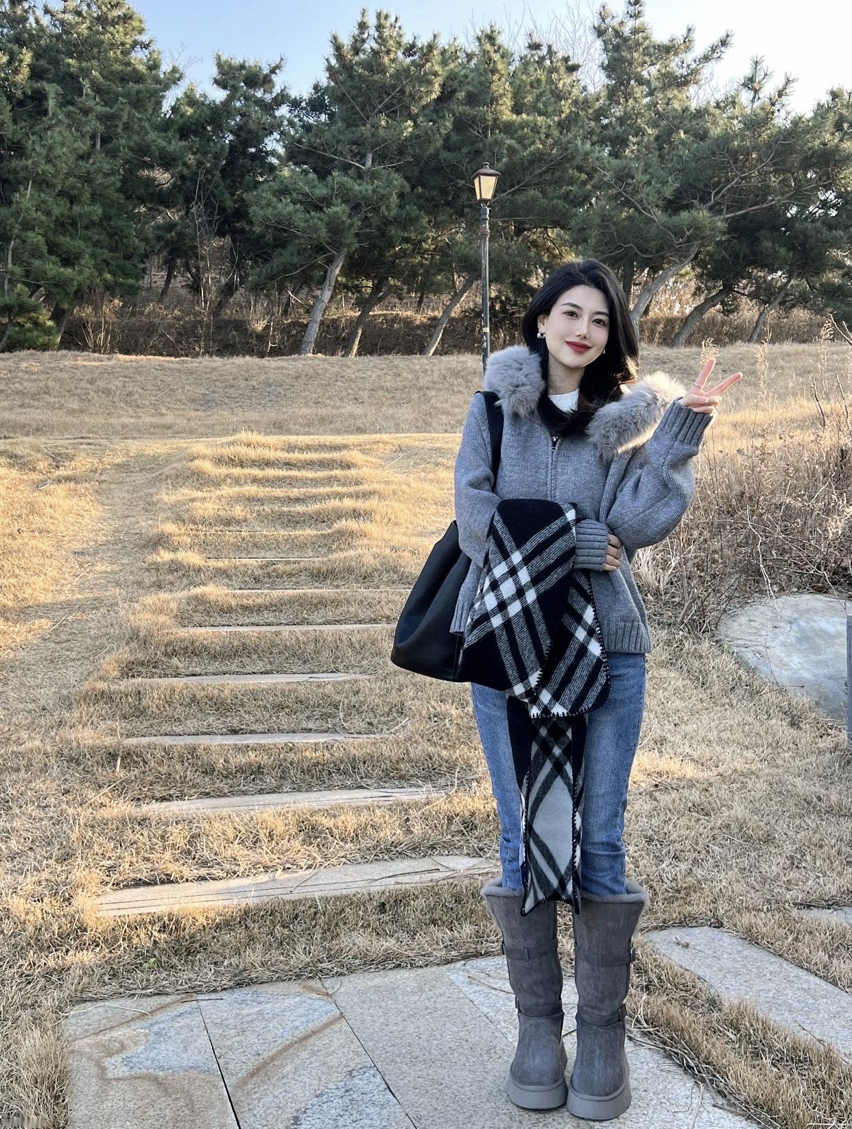 冬日暖阳下的时尚穿搭,灰色毛衣+牛仔裤+毛绒靴,温暖又舒适!🌞👗👢