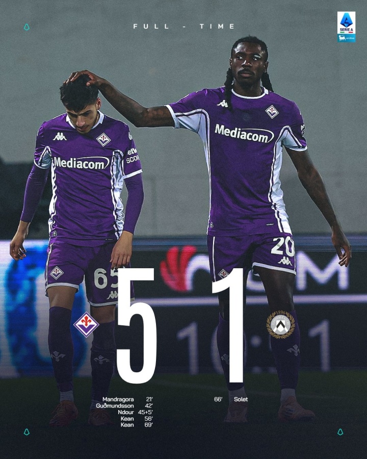 直播吧12月22日讯意甲第16轮,佛罗伦萨主场5-1大胜乌迪内斯,小基恩梅开二度,而乌迪内斯方面奥克耶在第7分钟就被直红罚下。