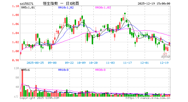 12月19日,恒生指数ETF(159271)涨1.09%,成交额653.89万元。当日份额减少100.00万份,最新份额为8438.67万份,近20个交易日份额减少800.00万份。最新资产净值计算值为8647.11万元。
