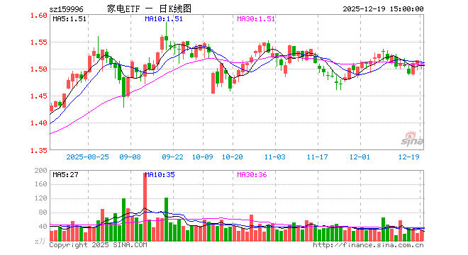 12月19日,家电ETF(159996)跌0.33%,成交额4552.32万元。当日份额减少1000.00万份,最新份额为9.43亿份,近20个交易日份额减少6000.00万份。最新资产净值计算值为14.24亿元。