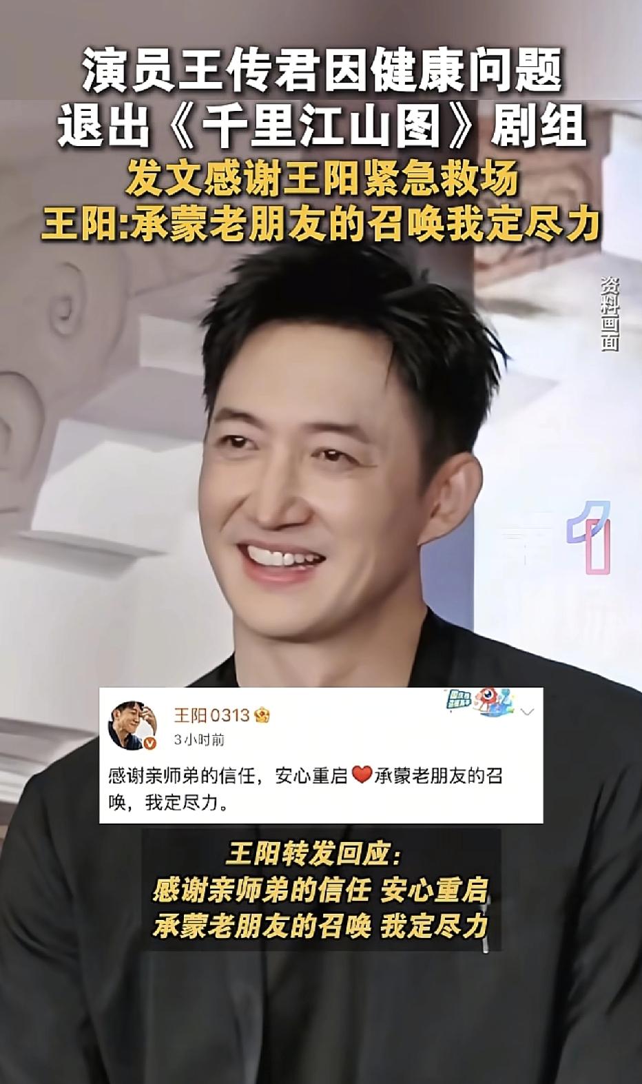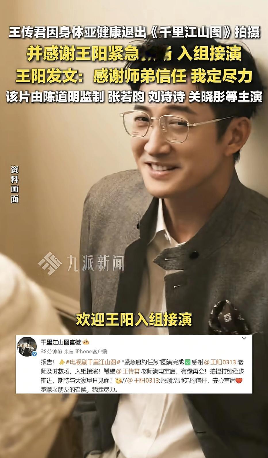 王传君发文因身体亚健康退出《干里江山图》,并感谢王阳紧急救场入组接演,王阳发文:感谢师弟信任,我定尽力。 这部剧是由陈道明监制,张若昀、刘诗诗、关晓彤等主演的,阵容强大,应该很好看。 因病中途退出实属无奈,但是王阳接演还是很期待的,王阳的眼神里更多的是正气 ,而王传君给人亦正亦邪的感觉,甚至有一种接底气的变态感,希望他能早日康复吧。(图片来源于网络侵删)