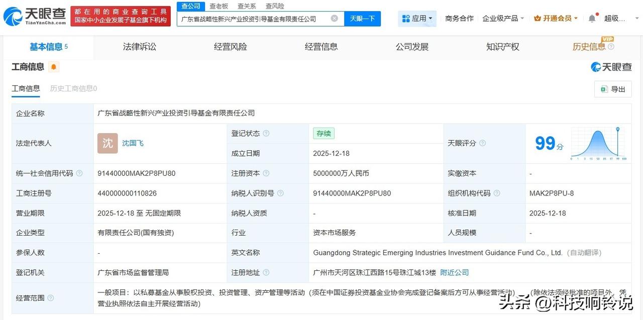 【广东战略性新兴产业投资引导基金公司成立 注册资本500亿】 天眼查工商信息显示,近日,广东省战略性新兴产业投资引导基金有限责任公司成立,法定代表人为沈国飞,注册资本500亿人民币,经营范围包括以私募基金从事股权投资、投资管理、资产管理等活动。股东信息显示,该公司由广东省财政厅全资持股。 天眼查信息: