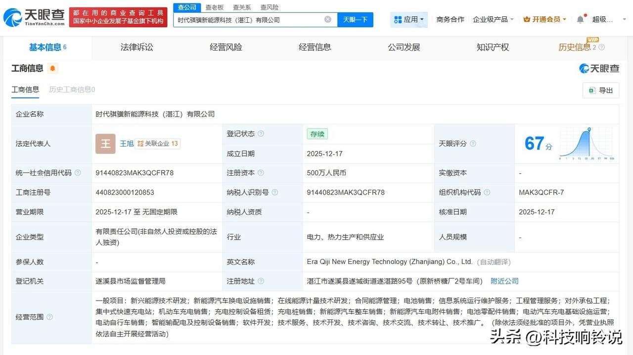 【宁德时代在湛江成立新能源科技公司 注册资本500万】 天眼查工商信息显示,近日,时代骐骥新能源科技(湛江)有限公司成立,法定代表人为王旭,注册资本500万人民币,经营范围包括新兴能源技术研发、新能源汽车换电设施销售、在线能源计量技术研发、合同能源管理、电池销售等。股东信息显示,该公司由宁德时代旗下时代骐骥新能源科技(广州)有限公司全资持股。 天眼查信息: