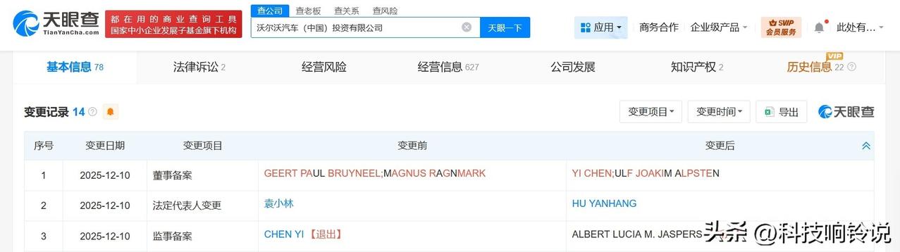 【沃尔沃汽车中国投资公司换帅 袁小林卸任沃尔沃汽车中国投资公司董事长】 天眼查工商信息显示,近日,沃尔沃汽车(中国)投资有限公司发生工商变更,袁小林卸任法定代表人、董事长,由HU YANHANG接任,同时多位高管发生变更。 该公司成立于2011年8月,注册资本3200万美元,经营范围含在国家允许外商投资的领域依法进行投资,在外汇管理部门的同意和监督下,在其所投资企业之间进行外汇平衡,为其所投资企业提供产品生产、销售和市场开发过程中的技术支持、员工培训、企业内部人事管理等服务。股东信息显示,该公司由VOLVO PERSONVAGNAR AKTIEBOLAG全资持股。 天眼查信息: