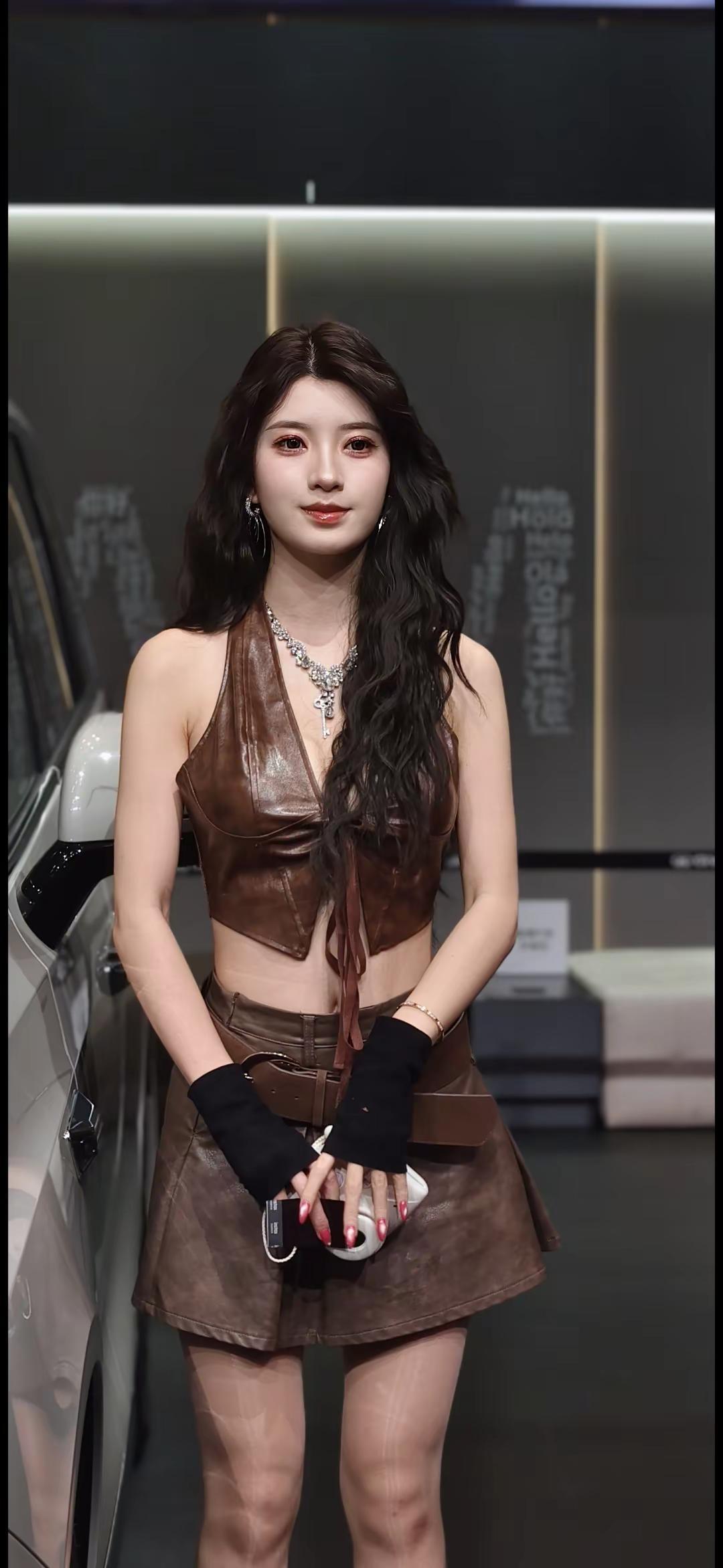 广州车展车模BB酱皮革辣妹装又纯又野BB酱 辣妹穿搭 美女