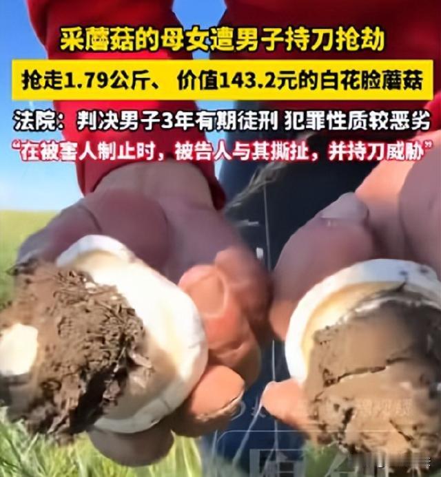 呼伦贝尔,母女俩辛苦上山采摘蘑菇,摘到一枚名叫白花脸的蘑菇,不料却被一名男子拦道抢劫,对方骑着摩托车,手持刀子,双方产生了撕扯。因为男子力气较大,行为较为暴力,最后抢走母女二人摘到的蘑菇,随后扬长而去。本来以此为生,谁知道劳动成果直接就被抢走。 新派新闻12月21日报道了这则新闻。据报道称,母女俩采摘到的这枚白花脸蘑菇,市场价值为143元,这位男子涉嫌抢劫罪,已经被处以强制措施。 在呼伦贝尔,陶某跟女儿以采摘蘑菇为生。母女俩经常会上山采摘蘑菇,采摘的蘑菇拿到市场上去卖,就可以获得生活经济来源。 事发当天,陶某又跟女儿前往茂盛的森林深处采摘蘑菇,二人带着工具、背着箩筐,一路面对荆棘,苦苦寻找比较不错的菌类。 当她俩来到一处草场的时候,陶某发现了一枚比较巨大的白花脸蘑菇。当时目测,这颗蘑菇的重量不轻,可以换取不少的钱款。 母女俩可真的是开心的很,拿出砍伐工具,费了九牛二虎之力,合力将蘑菇给采摘下来。当时母女俩就给这颗长势不错的白脸蘑菇称了重量:重达1.79千克。 这颗白脸蘑菇这个重量,经济还是很可观的,陶女士核算了一下,这一棵蘑菇,大概就可以换取143.2元的经济收入。母女二人可真的是欢喜的很,开心的将蘑菇放置到箩筐里去。 二人正准备撤离的时候,前面突然出现了一台摩托车,“轰隆隆”的朝着母女俩开过来。经过陶女士身旁的时候,这位男子停了下来。 来人正是胡某,他准备来干什么呢?好家伙,这位男子居然想要抢劫人家的蘑菇。就看到他把摩托车停下来,来到陶女士身旁,直接就开抢她的箩筐。 这是劳动人民的辛苦血汗呐,陶女士当时就意识到胡某想要干嘛,她拼尽全力的想要保全自己的蘑菇。就在撕扯期间,胡某居然从口袋里掏出了一把刀子。 就看到胡某拿出刀子,对着陶女士母女俩,威胁她俩道:“你俩要是敢反抗,我就削了你们,赶紧把蘑菇给我。” 面对胡某的威胁,陶女士母女俩吓得不知所措,感觉这就是明晃晃的抢劫啊。最后,母女俩非常无奈,只能乖乖交出蘑菇。陶女士望着女儿,二人面面相觑:今天辛苦一天的果实,只能这样拱手送人了。 眼看着白脸蘑菇顺利到手,胡某收起了刀子,挟带上蘑菇,直接就逃离了现场。陶女士见到歹人已经远去了,才敢拨打了110,请求工作人员前来帮忙。 经过查询胡某的逃离轨迹,最后终于将其抓捕归案。胡某因为涉嫌持刀抢劫,并且抢劫蘑菇的价值达到143元,被处以抢劫罪,判处有期徒刑三年,同时处以罚金2000元。 1.胡某当众持刀抢劫,夺走陶女士辛苦采摘的蘑菇,最后逃离现场。胡某的行为是否涉嫌违法,将会面临怎样的惩罚? 根据《刑法》第二百六十三条规定,以暴力、胁迫或者其他方式抢劫公私财物的,此举构成抢劫罪,将会被判处三年以上十年以下有期徒刑,并且处以罚金。 陶女士母女俩以采摘蘑菇为生,辛苦劳作之后,却遭受了胡某的暴力抢劫,甚至拿出刀子扬言威胁,这个举动已经符合抢劫罪的构成要件。 胡某的行为不仅侵害了个人的财产权,还破坏了公共秩序,最终也是依法做出了判决。胡某不仅将要面临3年的刑事判刑,还被处以2000元的罚款,此举既维护了法律的尊严、也维护了受害人胡女士母女俩的合法权益、稳定了公共秩序。 2.胡某抢夺价值143元的蘑菇,虽然价值不高,他会面临怎样力度的判刑? 根据《刑法》规定,公开当众持刀抢劫,此举已经构成抢劫罪。抢劫罪的量刑主要看行为性质,并非财物价值。持刀抢劫已经构成暴力胁迫,不能因为抢劫物品便宜就轻判。 本案中的母女在采摘蘑菇之后,遭到胡某的持刀抢劫。根据行情价值可知,抢劫走的蘑菇价值在143元左右,虽然价格不高,但是胡某的行为恶劣,并不会因为物品便宜就轻判,他最终必定要面临非常严厉的法律惩处。 公然抢夺他人的劳动果实,此举实在过于恶劣,当然,最后胡某难逃法网。对此,大家都作何看法呢?
