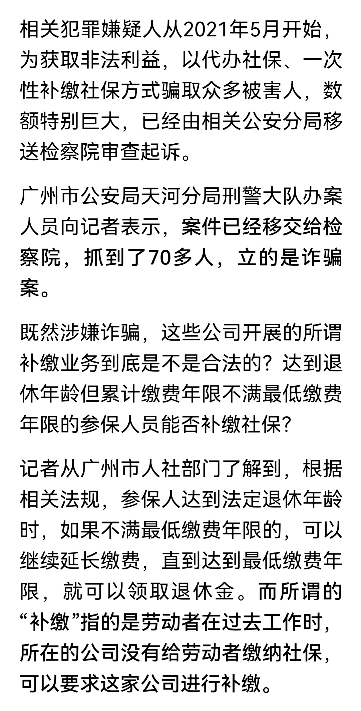 千人被骗过亿补缴社保没捷径 为什么会被骗?不外乎以下几点:1. 快到法定退休年龄缴费年限不够,想按时退休领养老金,就轻信“熟人”“中介”的花言巧语,结果被骗大笔钱财还不了休。2. 不懂社保政策,听社保局说不能补只能继续缴费,心里想总有其他渠道可以走捷径,侥幸心理害了自己。3. 不会查询社保缴费记录,这些骗子公司并没有去给他们参保把钱缴到税务部门。只要自己去网上或社保局查一下,还可能有及时止损的机会。其实根本原因是,该交社保时不愿交,不少人还嘴硬,说什么不如存银行或者活不到退休,等他们到了案例中这些被骗人的年纪时,也会面临同样的问题。养老保险本就是一个长期积累的过程,年轻时不积累,年老时就没有待遇可领。网上那些劝你不交社保的人,要么是蠢,要么是坏。尤其是很多财经博主,你交了社保,就不会有更多的钱去买他们推荐的“产品”。社保的收益远远超过你的想象,国家每年投入相当数量的财政资金补贴社保基金,你不参加社保,那些补贴就与你毫无关系。养老保险那些事儿