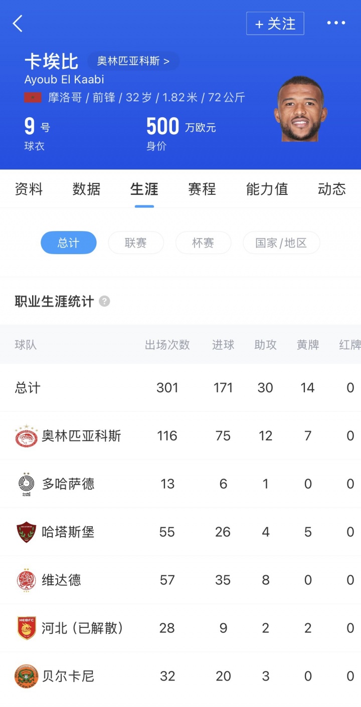 卡埃比现年32岁,司职前锋,曾于2018-2019年效力中超河北队。在当时金元时代的巨星潮流中,卡埃比28场9球2助并没有给中国足坛留下太多印迹。