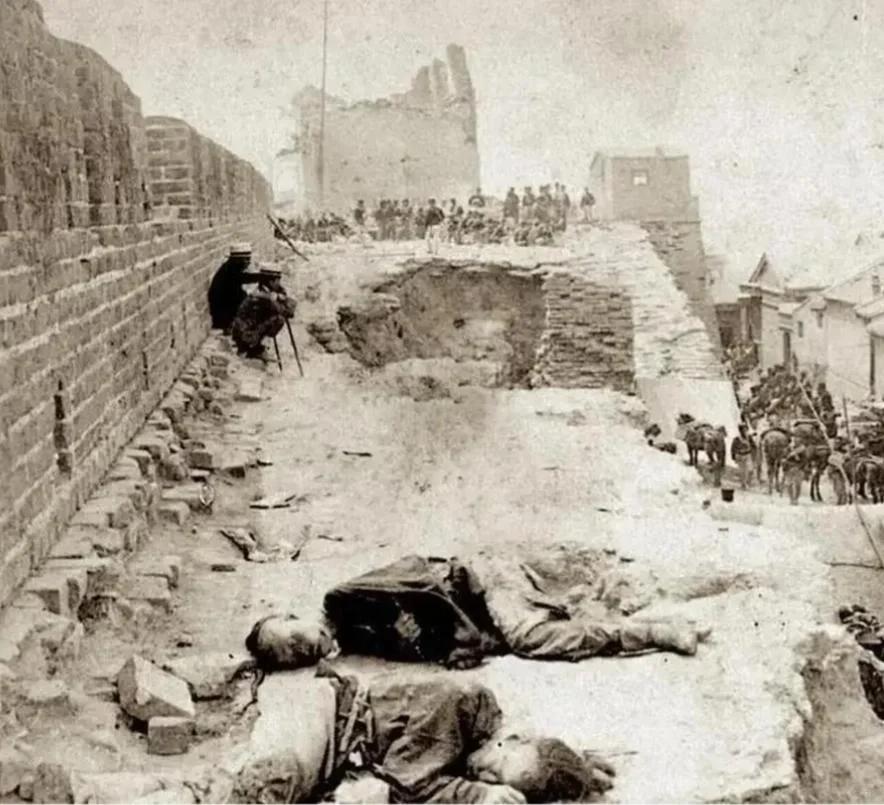 1900年,天津,青砖城墙被近代火炮轰开一道豁口,墙顶步道的尘沙里,清军士兵与义和团拳民的遗体静静摊着,半蜷的肢体还留着抵抗时的姿态。 墙根处,几名八国联军士兵弓身伫立,远处隐约可见联军骑兵的马队与人群,侵略者的喧嚣,衬得牺牲者的沉寂更显悲壮。