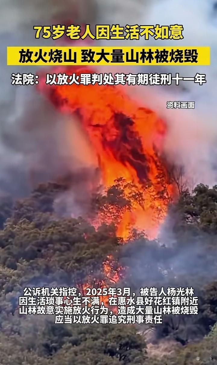 不敢相信怎么会有这样的人,贵州一75岁老人因为生活琐事心生不满,居然放火烧山,造成大量山林被毁。 近日公安机关已经公开审理,综合考虑老人的情况,老人被判处有期徒刑11年。 生活不如意也不能放火烧山啊,要想想为什么会不如意,不如意还不是自己造成的? 生活那有那么如意,如果大家都像这样,那社会不是乱套了? 严惩不贷,老人也应该严惩! 你们怎么看这种行为呢?