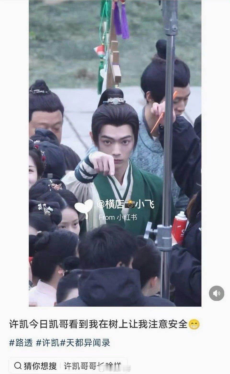 许凯让代拍注意安全就是说这大冷的天,许凯给人看的心里暖暖的啊,许凯在新剧《天都异闻录》的片场。看到对面树上蹲的代拍,贴心的让对方下来,就是说外表酷酷的boy,居然是个大暖男啊~许凯看到代拍蹲树上的反应