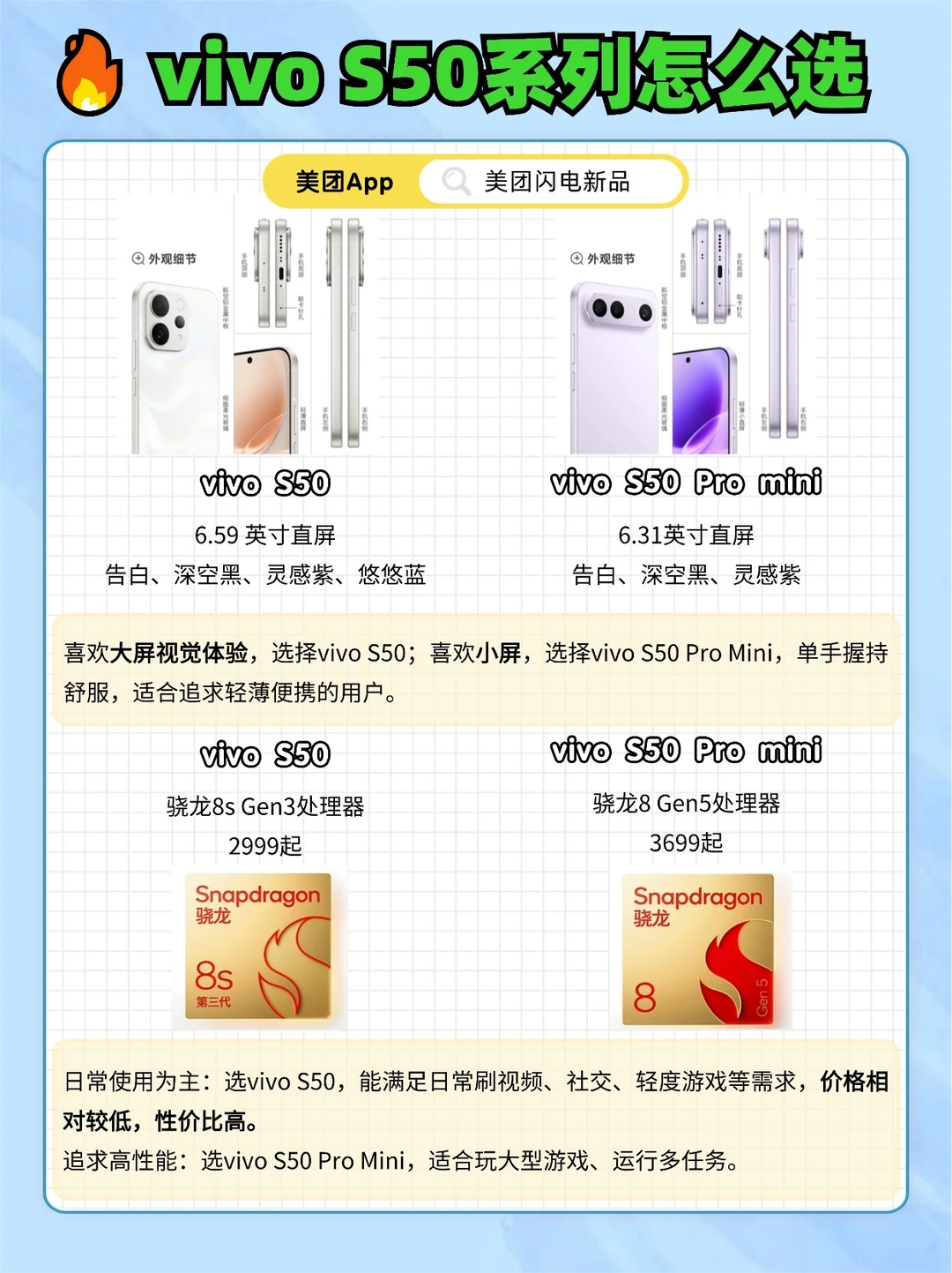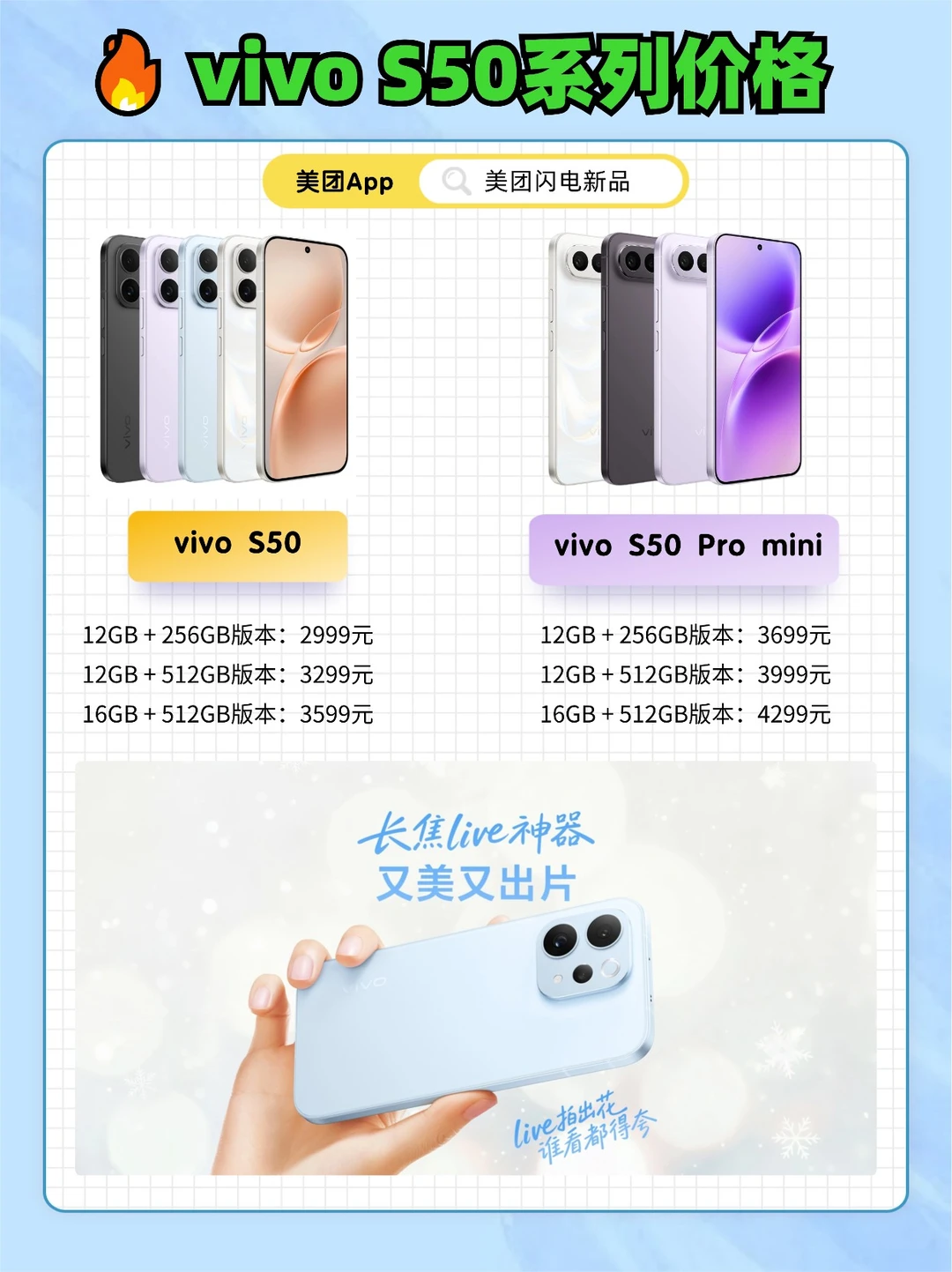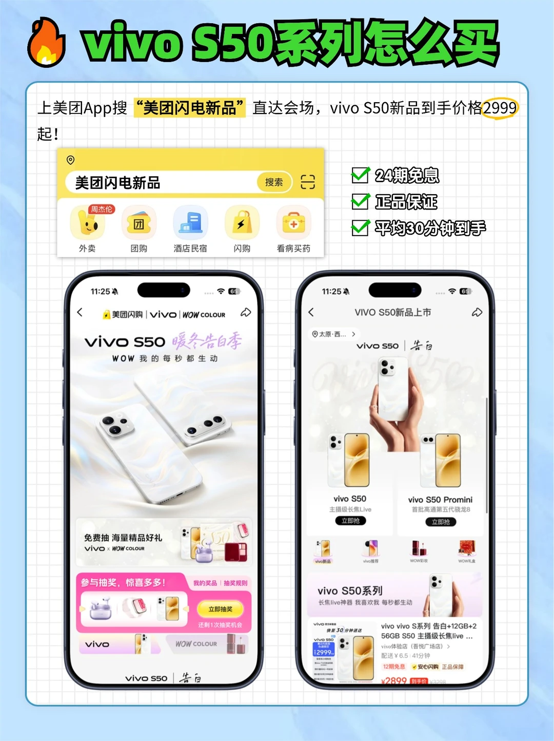 上美团App搜“美团闪电新品”直达会场,vivo S50新品到手价格2999起,24期免息,正品保证。