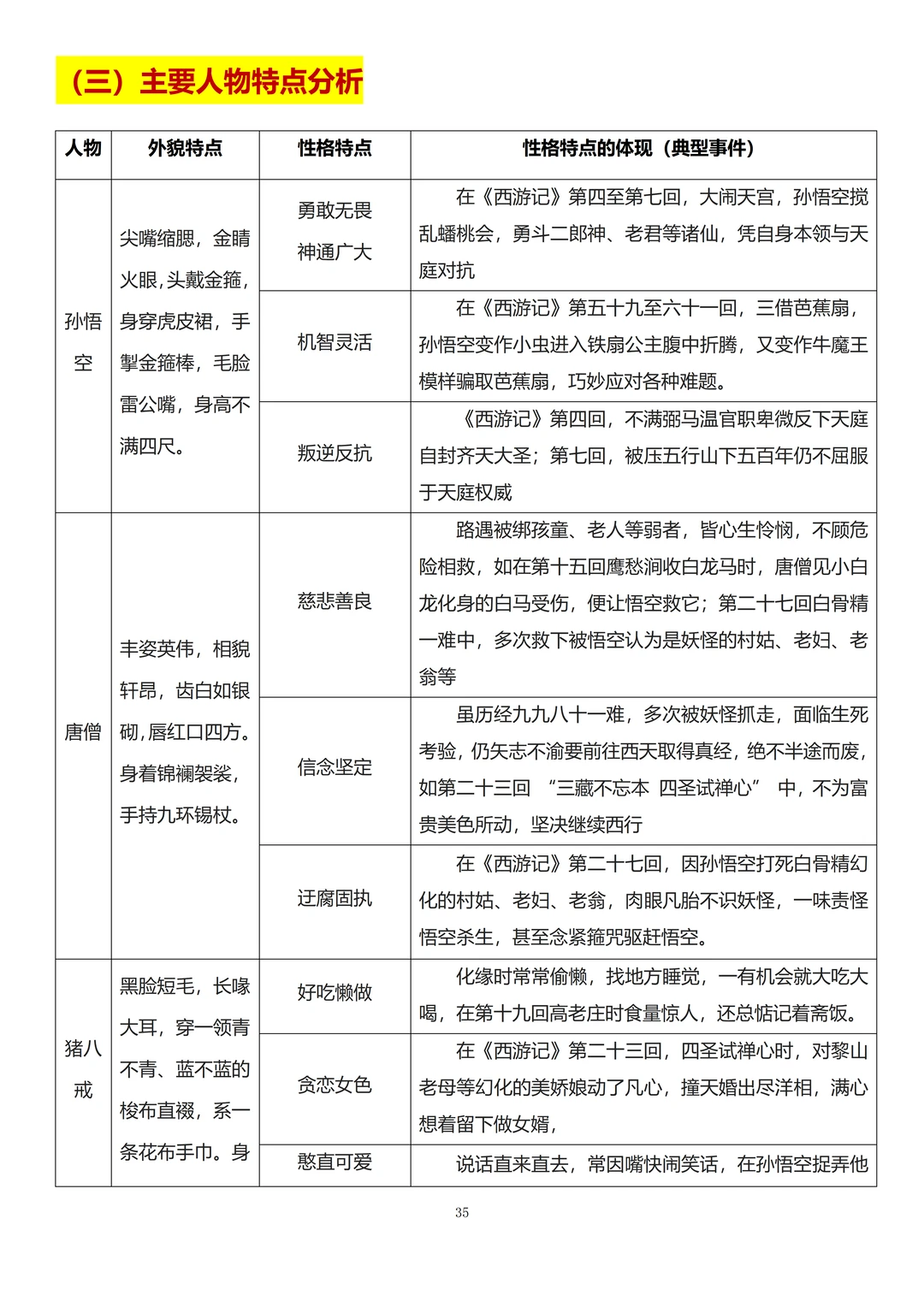 3、孙悟空、唐僧、猪八戒、沙僧的外貌、人物形象及其对应情节。