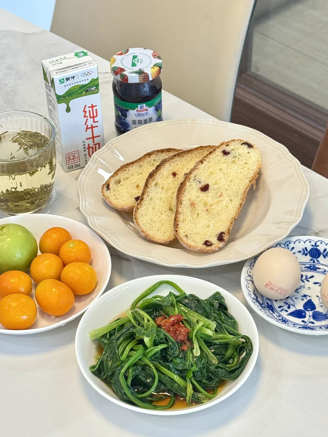 周末早餐[星R] 蔓越莓欧包 水煮菠菜 水煮鸡蛋 牛奶、水果 餐后一杯绿茶 我非常喜欢的一盒茶叶,剩最后这一杯了 好舍不得喝完,因为商品已下架[完啦R]